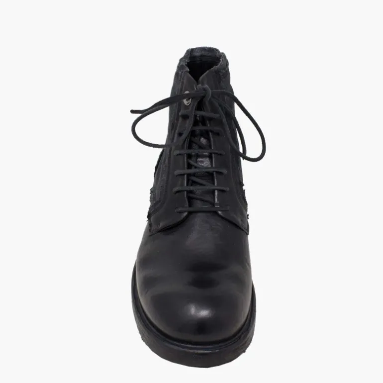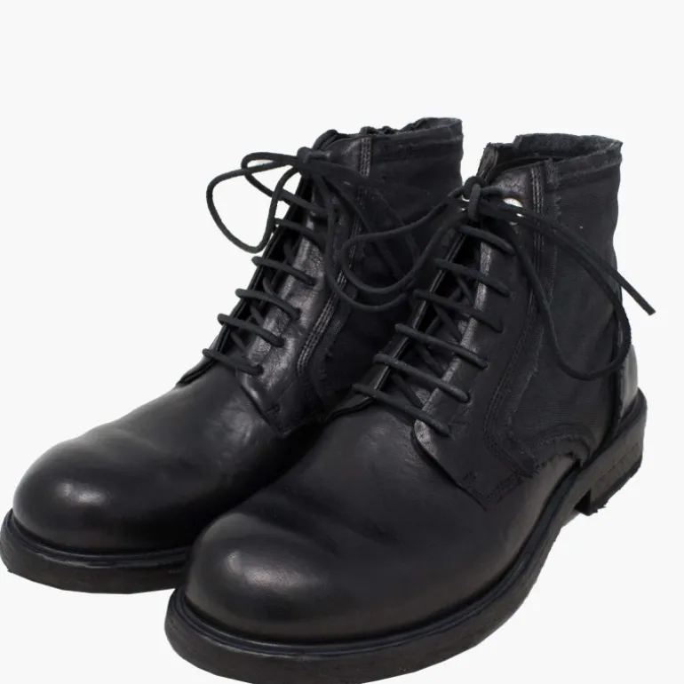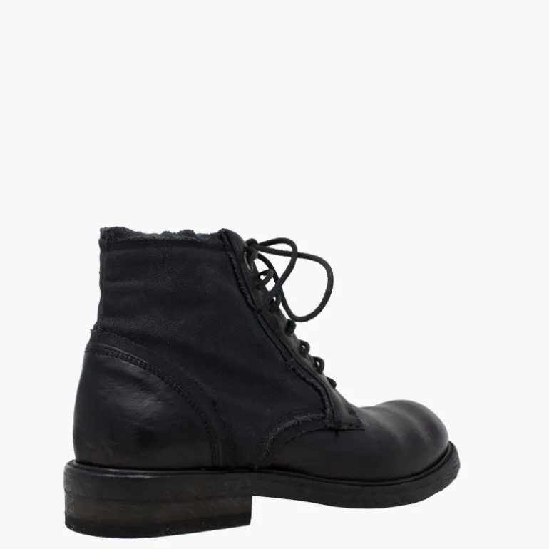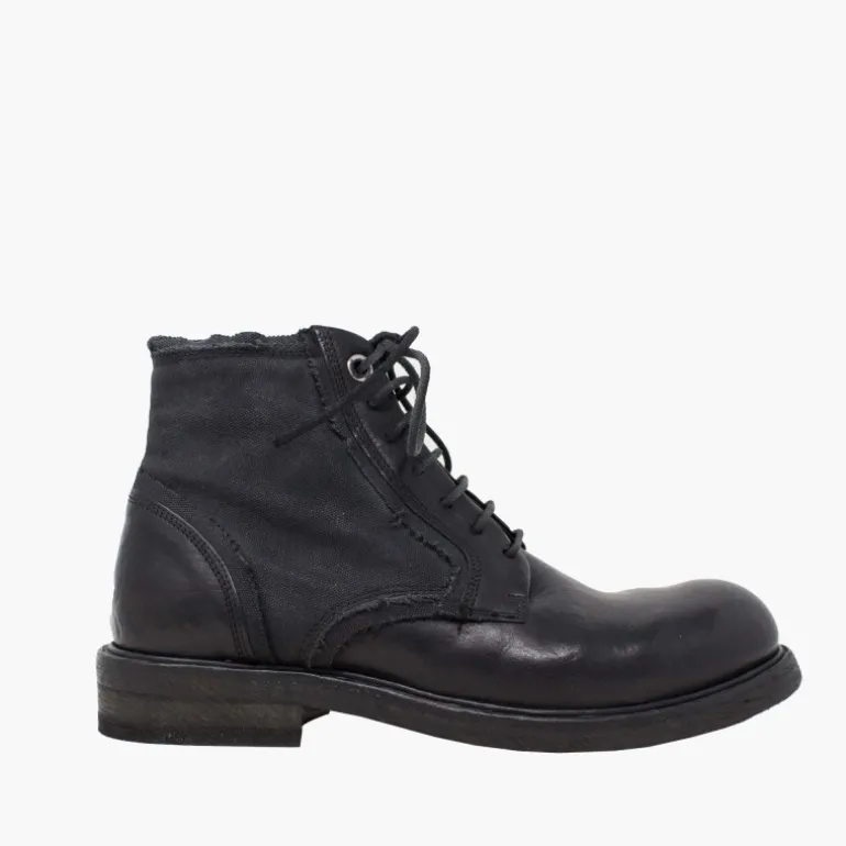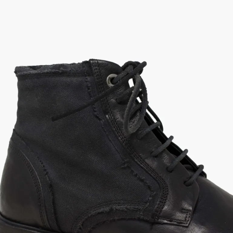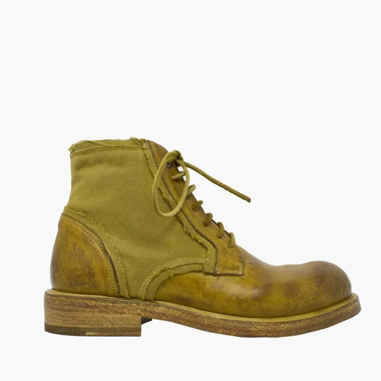 Botki zostały wykonane z płótna canvas oraz ze skóry bawolej w formie crust, garbowanej roślinnie. Szycie zostało zrealizowane w technice IDEAL.