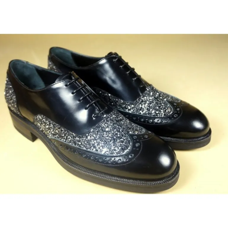 Ekskluzywne skórzane buty Milva przyciągają spojrzenia elegancką sylwetką oraz przepięknym wykonaniem. Buty powstały z połączenia doskonałej jakości włoskiej skóry cielęcej oraz luksusowego materiału z efektem Swarovski – Ciemne Srebro. Całość urzeka wyrafinowaną elegancją i prezentuje się niebywale efektownie.