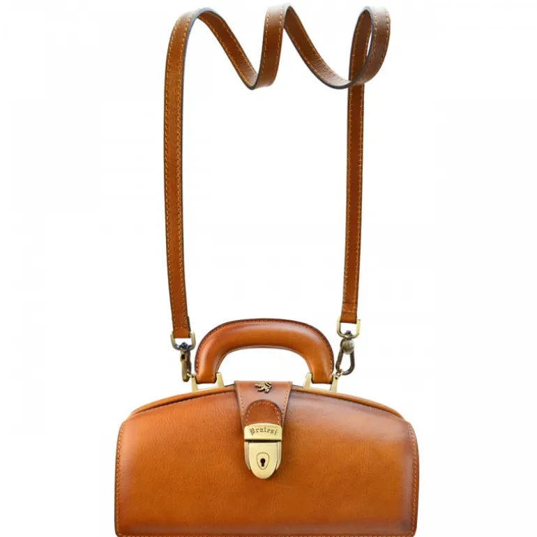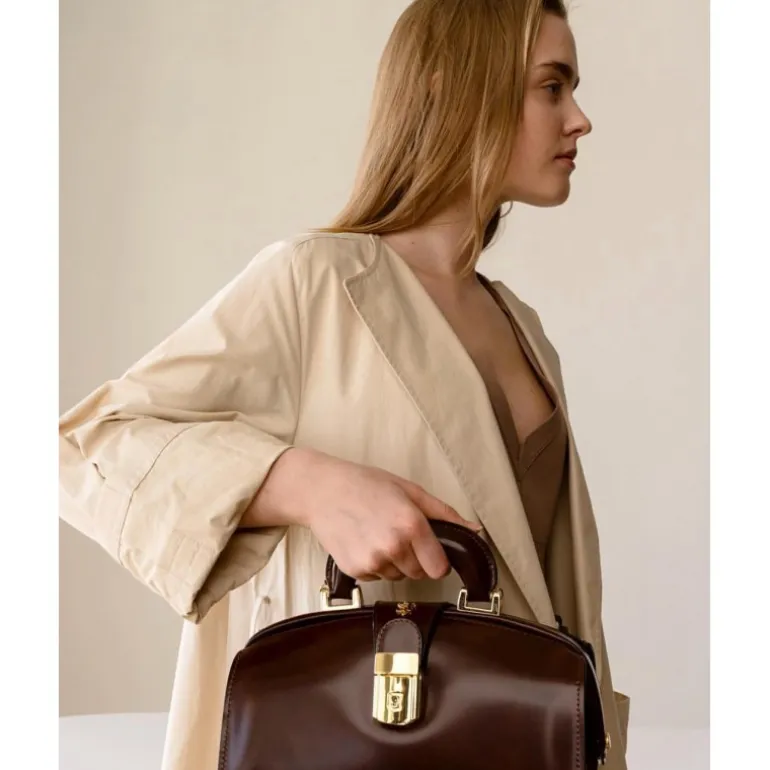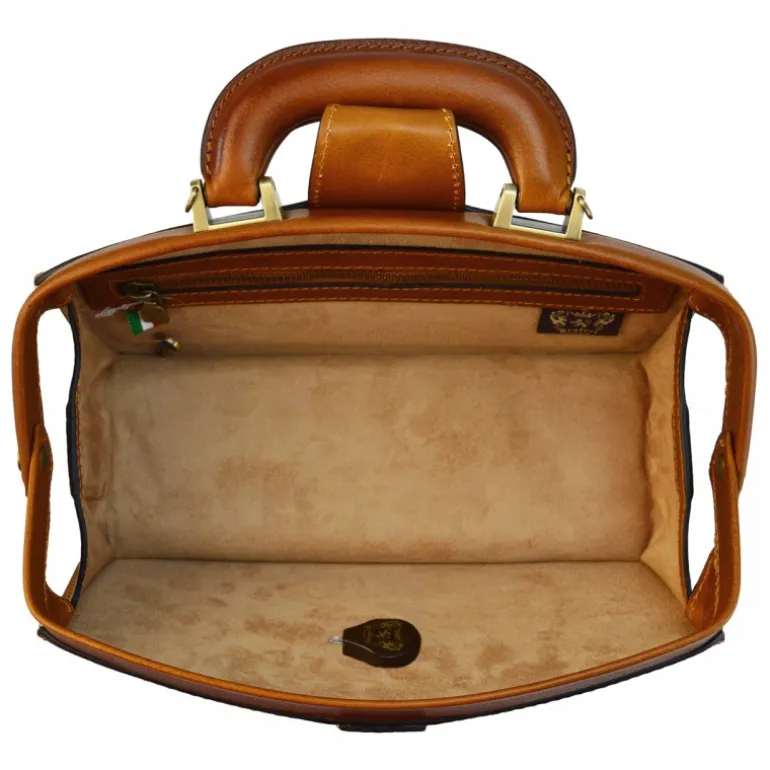 Damska skórzana torebka z zamkiem na klucz to niezwykle stylowy produkt, który urzeka klasyczną formą oraz przepięknymi zdobieniami. Wśród nich należy wymienić pozłacane, metalowe części oraz zamknięcie na klucz. Dodatkowo model ten posiada rączkę oraz skórzany pasek, została wyprodukowana z włoskiej skóry o garbowaniu typu Radica. To dzieło florenckich rzemieślników, które jest precyzyjnie wykonane. Model ten posiada dobrze rozplanowane wnętrze, które uzupełnia praktyczne oświetlenie LED.