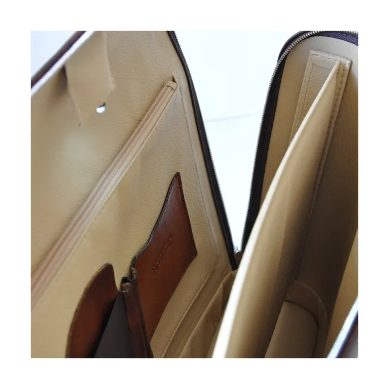 Elegancka skórzana aktówka na laptopa została wykonana ze skóry szlachetnej garbowanej roślinnie i farbowanej ręcznie. Teczka posiada specyficzne zamknięcie na zamek, które umożliwia dwa sposoby jej otwarcia. Częściowe otwarcie zamku przekształca teczkę w aktówkę, natomiast całkowite w walizkę typu 24H. Dodatkowo kieszeń na zamek, kieszonka na telefon komórkowy, szlufki na długopisy i kieszonka na wizytówki. Teczka jest zamykana na kłódkę na klucz, wewnątrz sympatyczne światło, które gaśnie automatycznie po 30 sekundach. W wyposażeniu wygodny odpinany pasek, zewnętrzna kieszeń oraz bawełniany worek.