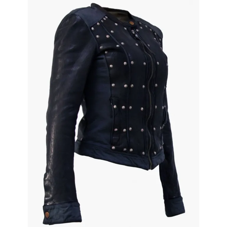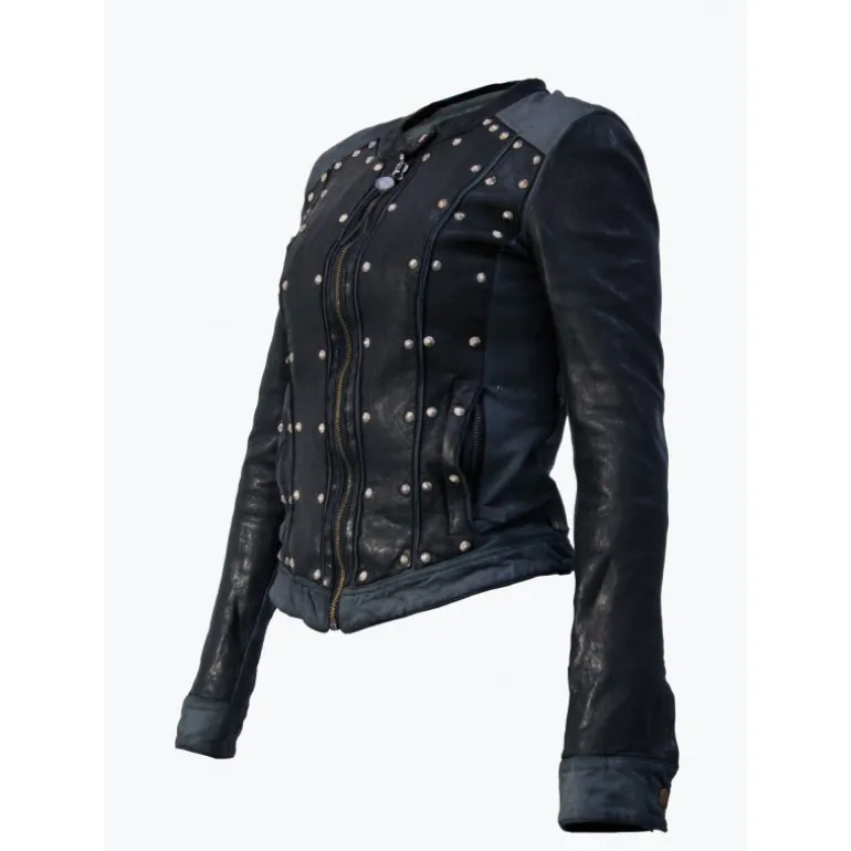 Skórzana kurtka damska Strisce e Borchie sprawi, że każda stylizacja zyska wyrazisty i niezwykle kobiecy charakter. Kurtka została wykonana przez toskańskich rzemieślników, a do jej produktu posłużyła najlepsza gatunkowo, garbowana roślinnie skóra jagnięca.