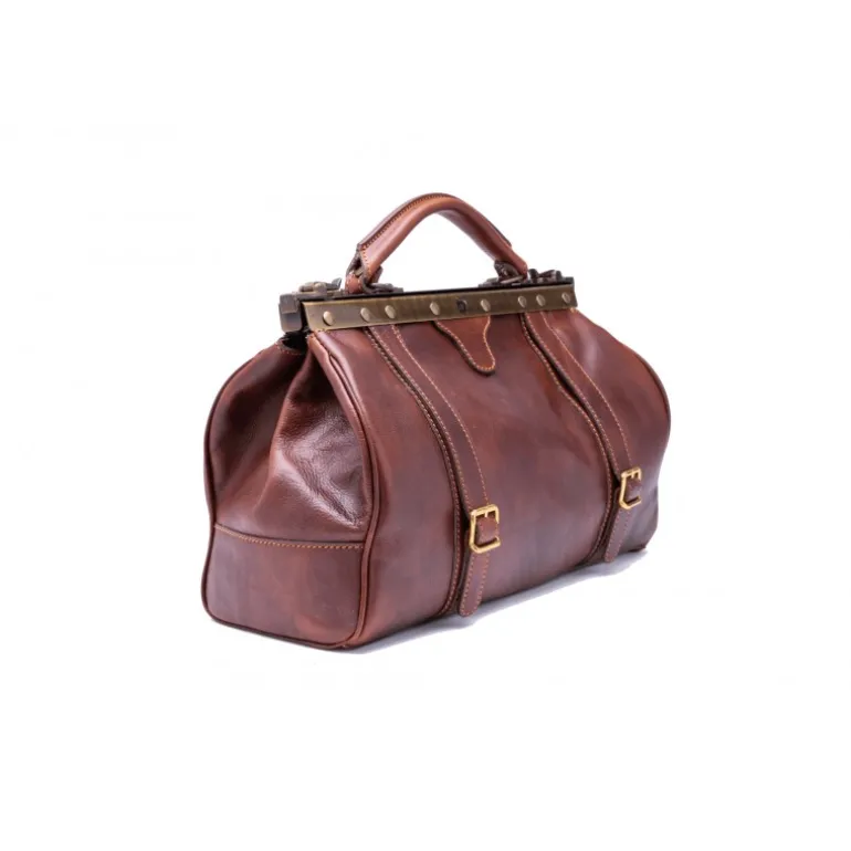 Lekarska torba damska z prawdziwej włoskiej skóry Wykonana z ręcznie barwionej toskańskiej skóry licowej. Wnętrze torby lekarskiej wyłożone jest stylową syntetyczną podszewką. Skórzane paski z klamrą na zewnątrz. Mosiężne zamknięcia do układania w stosy w kolorze mosiądzu z haczykami na końcach w stylu „Old America”.