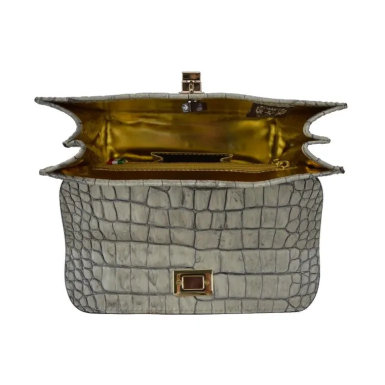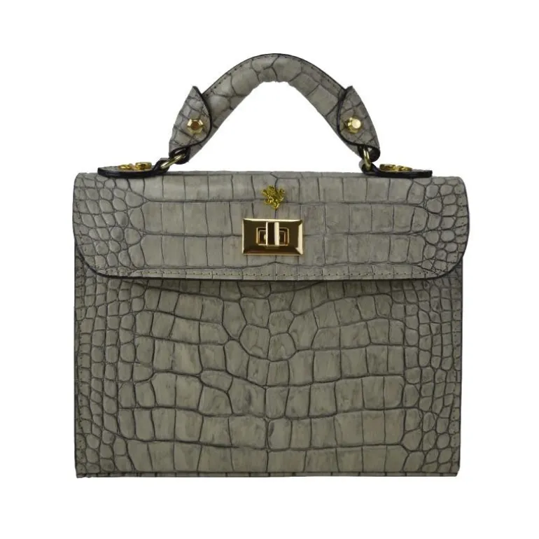 Listonoszka damska ze skóry ozdobiona wzorem imitującym skórę krokodyla przypadnie do gustu kobietom, które cenią klasę i szyk na najwyższym poziomie. Pomimo kompaktowych wymiarów, torebka przyciąga spojrzenia i prezentuje się niezwykle efektownie. Ten piękny model nada szyku nawet zwykłym, codziennym stylizacjom. Idealnie współgra również z eleganckimi kreacjami na wyjątkowe okoliczności. Torebka damska skórzana Lucignano k280 20 wyszła spod ręki mistrzów rzemieślnictwa z samej Florencji. Z przodu torebki zostało umieszczone logo producenta – prestiżowej marki Pratesi. Dzięki temu, torebka prezentuje się jeszcze bardziej szykownie i ekskluzywnie.