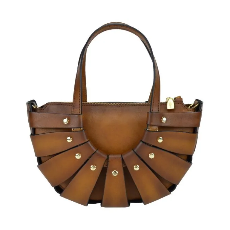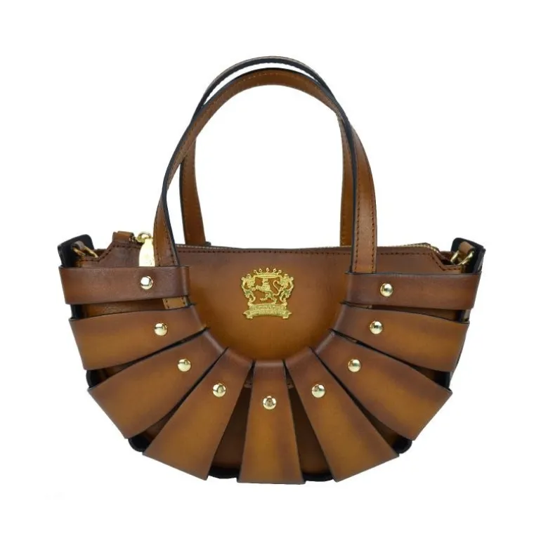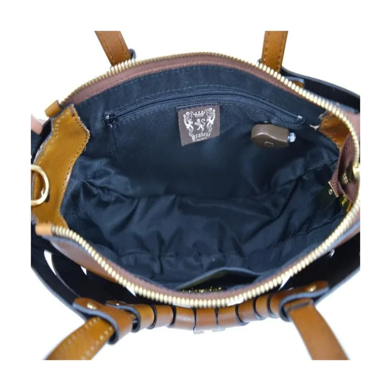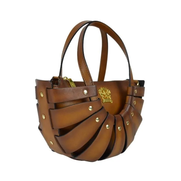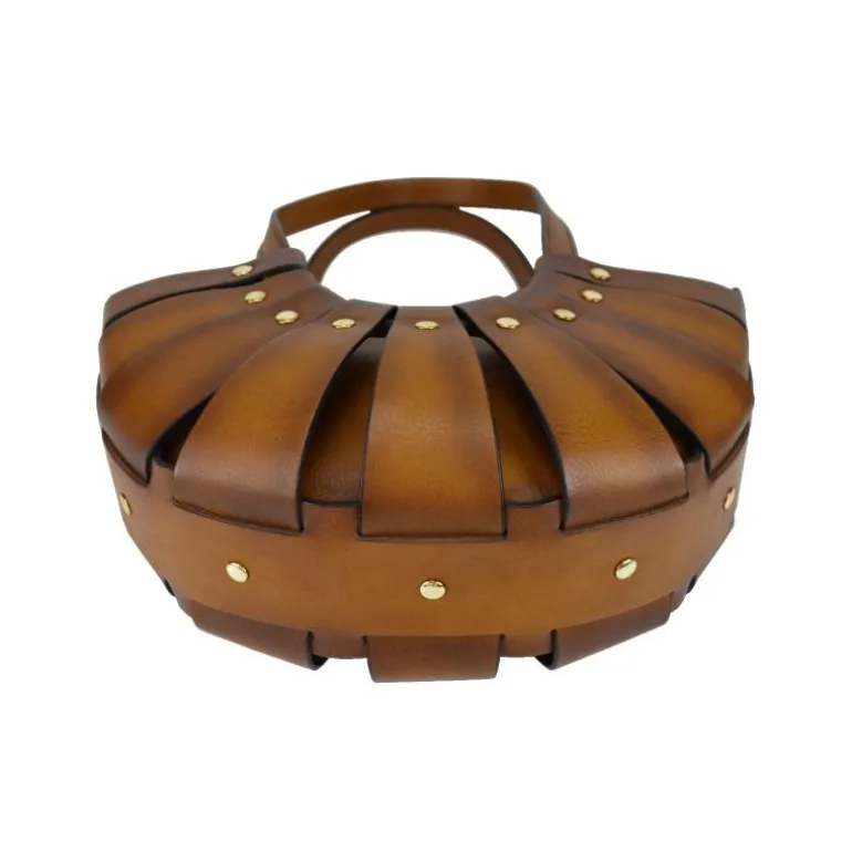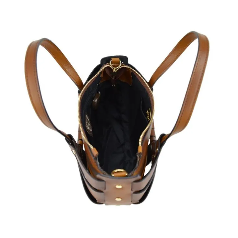 Materiał: skóra cielęca garbowana roślinnie. Wysokość cm 17, szerokość cm 28, głębokość cm 13, długość paska na ramię 120 cm, waga kg 0,5. Rączka ze skóry. Długość rączek cm 50. Zamknięcie: z metalowym zamkiem błyskawicznym.
