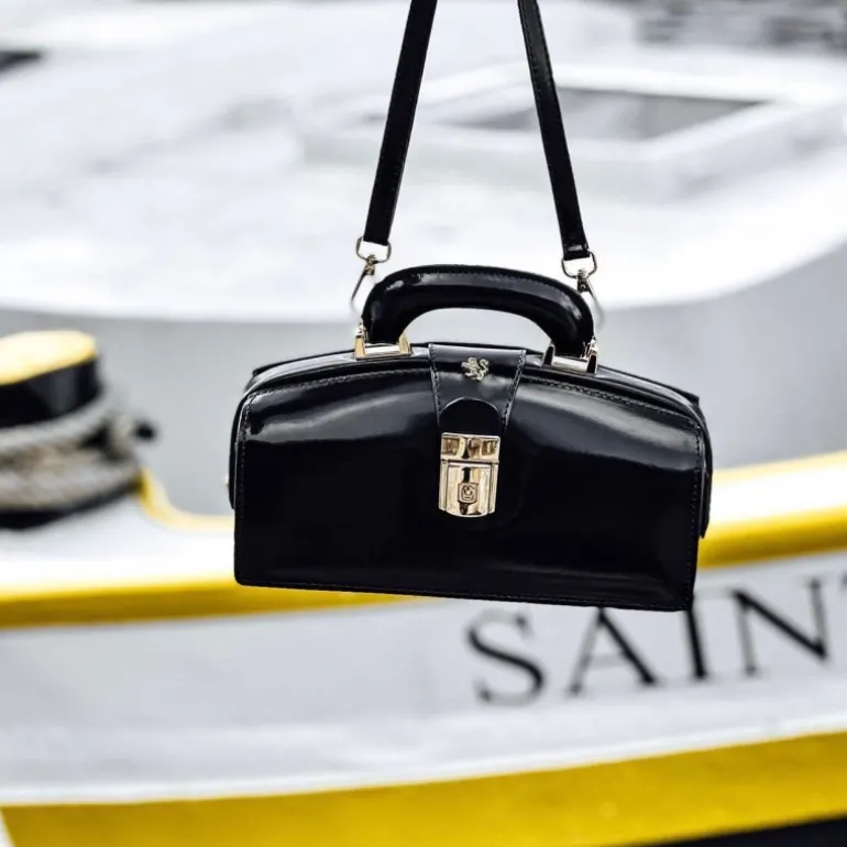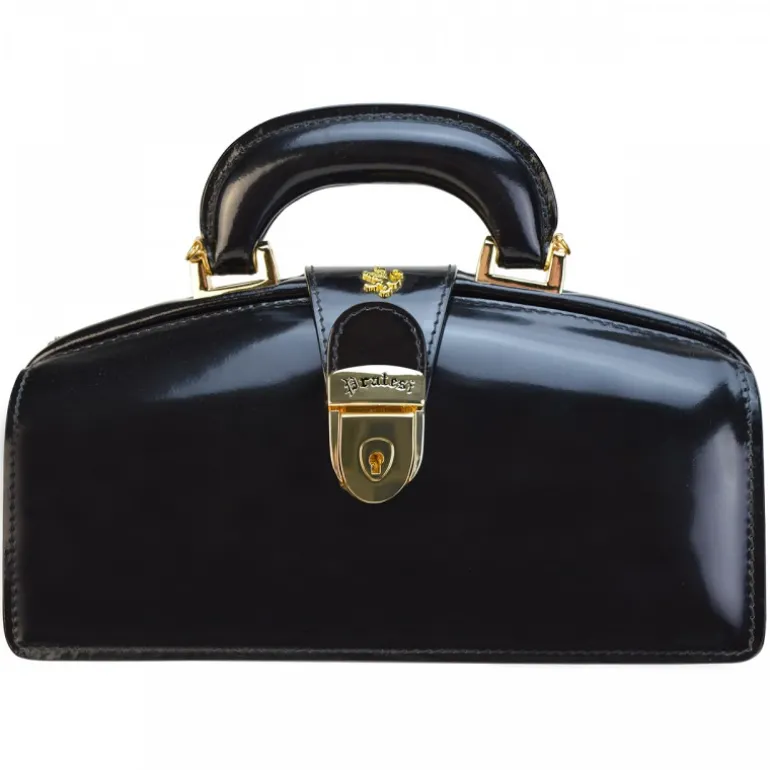 Materiał Skóra cielęca. Szerokość 27,5 cm. Wysokość 15 cm. Głębokość 15,5 cm. Rączka/Pasek Metal pokryty skórą. Części metalowe Pozłacane. Zamknięcie Na klucz. Waga kg 0,800