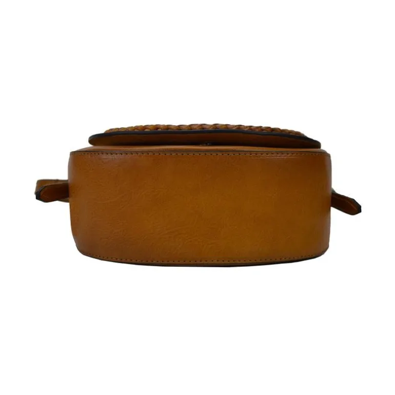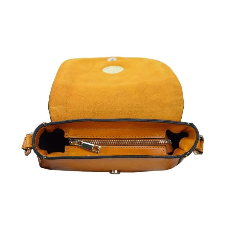 Materiał: skóra cielęca garbowana roślinnie. Wysokość cm 20, szerokość cm 21, głębokość cm 8, długość paska na ramię 120 cm, waga kg 0,6. Zamknięcie: z klapą i z metalowym zamkiem błyskawicznym.