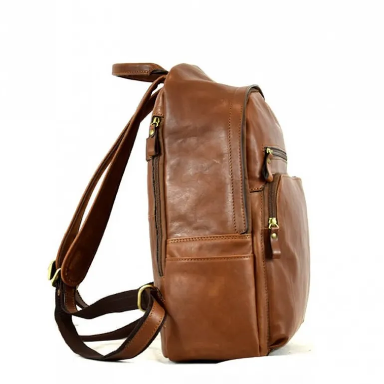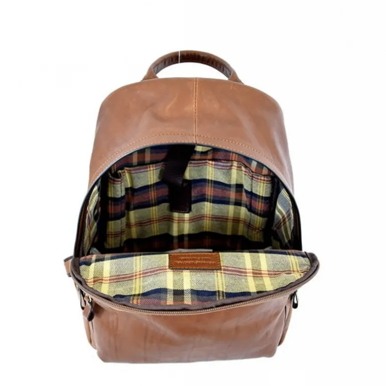 Męski plecak ze skóry na czas wolny i na podróż, duża kieszeń z przodu zamykana na zamek błyskawiczny, uchwyt, duża kieszeń z przodu zamykana na zamek błyskawiczny, mała kieszeń z przodu zamykana na zamek błyskawiczny, 2 otwarte kieszenie z boku, zamykany na zamek błyskawiczny, wewnątrz dobrze zorganizowana przestrzeń, podszewka w szkocką kratę, można go przystosować również na trolley, akcesoria z postarzonego szczotkowanego mosiądzu.