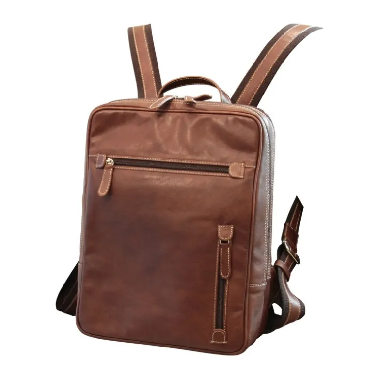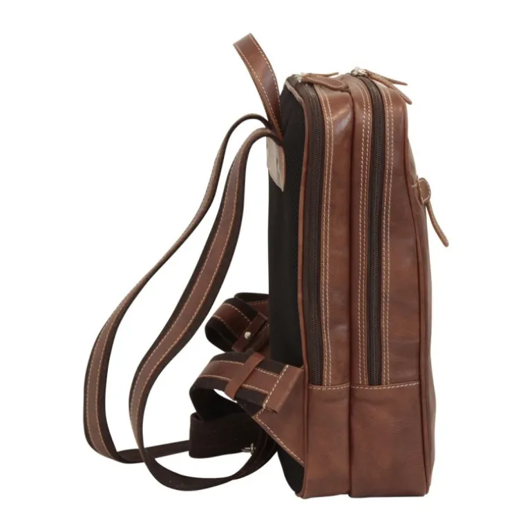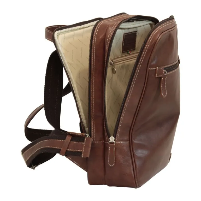 Skórzany plecak z kieszenią na laptopa, podszyty bawełną, duża komora główna, przegroda na komputer 13″, widoczna kieszeń na tarczy przedniej, wewnętrzna kieszeń na telefon komórkowy, duża komora główna, zewnętrzne mosiężne zamki, regulowane bawełniane i skórzane szelki oraz siatka na plecach.