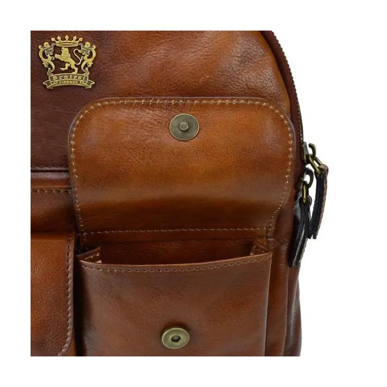 Plecak z włoskiej skóry z przednimi kieszeniami garbowanej roślinnie to wyjątkowo udane zestwienie wyrafinowania i praktyczności. Jest noszona przez jedno ramię oraz wyposażona tak, aby zaspokoić każdą potrzebę, pojemna, wygodna, o opływowych kształtach. Wewnątrz jest podzielona na różne przegrody oraz oświetlona światłem typu LED uruchamianym poprzez przycisk. W wyposażeniu bawełniany worek.