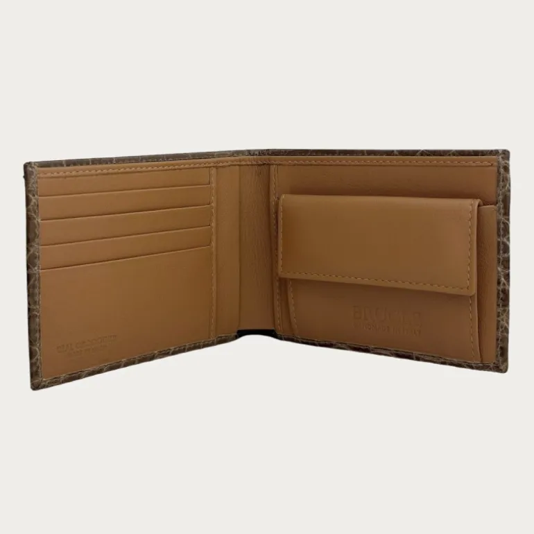 Portfel krokodyl z kieszonką na monety. Elegancki i wygodny kompaktowy portfel z prawdziwej skóry krokodyla, w błyszczącym, koniakowym kolorze, który podkreśla naturalne piękno łusek. Dodatek o wyjątkowej elegancji.