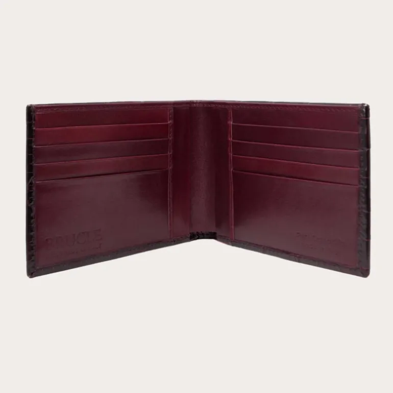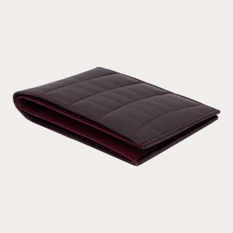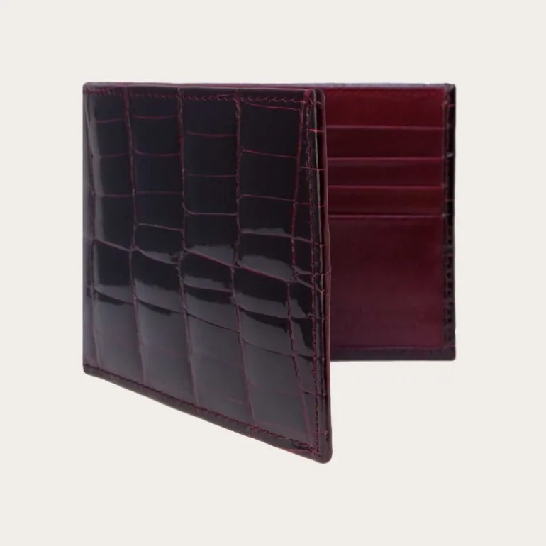 Portfel z prawdziwej skóry krokodyla. Elegancki i wygodny kompaktowy portfel z prawdziwej skóry krokodyla, w błyszczącym, bordowym kolorze, który podkreśla naturalne piękno łusek. Dodatek o wyjątkowej elegancji.