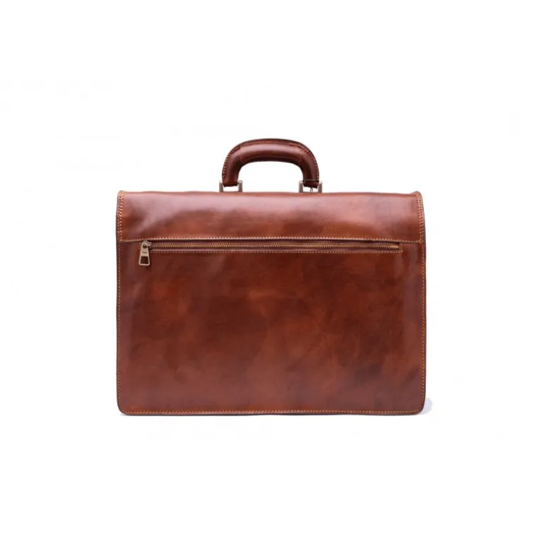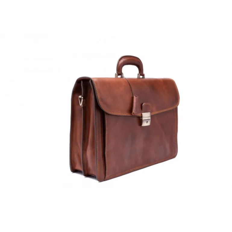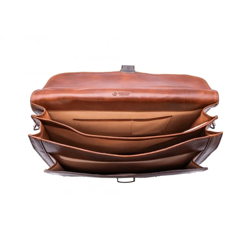 Pojedynczy uczwyt, 2 komory, 1 duża kieszeń z przodu, zamykana, pasek ze skóry z możliwością regulowania długości, zamekana na klucz, wewnątrz dobrze zorganizowana przestrzeń, podszewka z naturalnej skóry, akcesoria z postarzonego i szczotkowanego mosiądzu