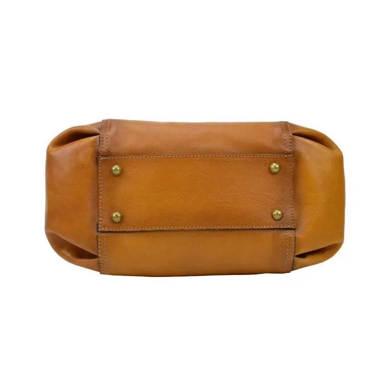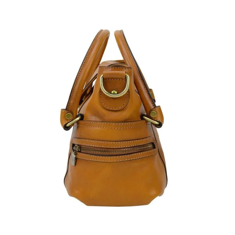 Materiał: skóra cielęca garbowana roślinnie. Wysokość cm 25, szerokość cm 33, głębokość cm 16, długość dłuższego 120 cm, waga kg 0,8. Rączka ze skóry, długość rączek cm 65. Zamknięcie Metalowy zamek.