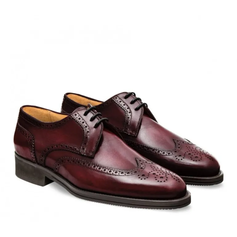 Skórzane męskie buty sznurowane, model derby full brogue z oryginalnymi dziurkowanymi detalami. Wykonany z naturalnej skóry cielęcej postarzanej przez mistrzów florenckich, w całości ręcznie barwiony, tworząc widoczne odcienie. Nosek w kształcie jaskółczego ogona, dekoracyjny wzór, wygodna skórzana wyściółka i lekka gumowa podeszwa czynią z tego stworzenia ponadczasową klasykę.