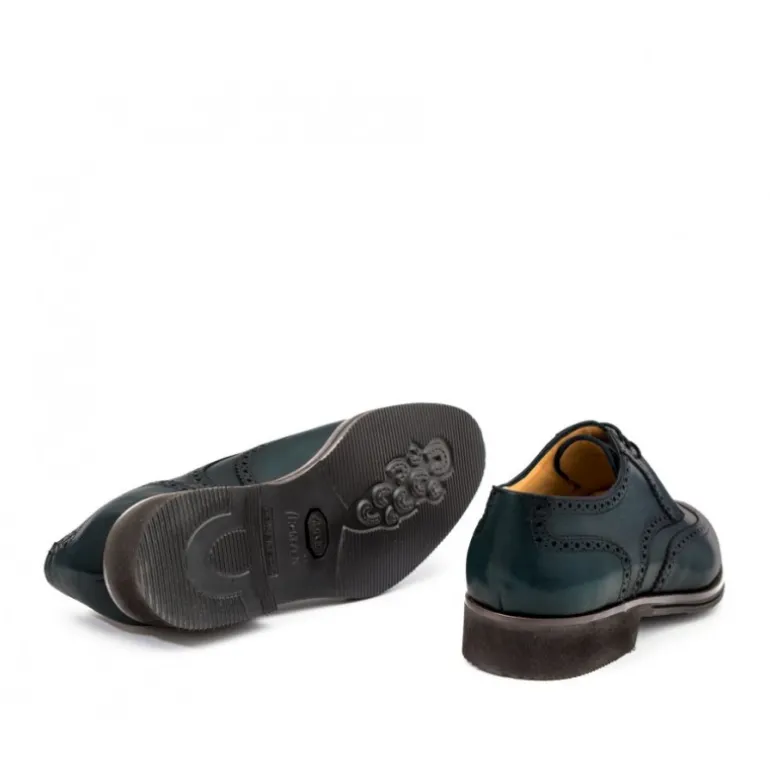 Skórzane męskie buty sznurowane, model derby full brogue z oryginalnymi dziurkowanymi detalami. Wykonany z naturalnej skóry cielęcej postarzanej przez mistrzów florenckich, w całości ręcznie barwiony, tworząc widoczne odcienie. Nosek w kształcie jaskółczego ogona, dekoracyjny wzór, wygodna skórzana wyściółka i lekka gumowa podeszwa czynią z tego stworzenia ponadczasową klasykę.