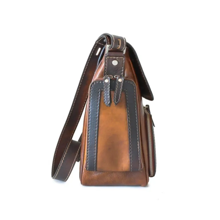 Sportowa skórzana torba z kieszonkami. Ta piękna listonoszka stanowi idealny przykład wyjątkowego włoskiego wzornictwa! Ma niezwykle ciekawy design, przyciąga uwagę swoim niepowtarzalnym kształtem oraz zawiasami umieszczonymi po bokach i z przodu.