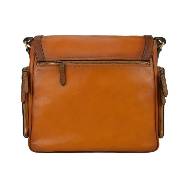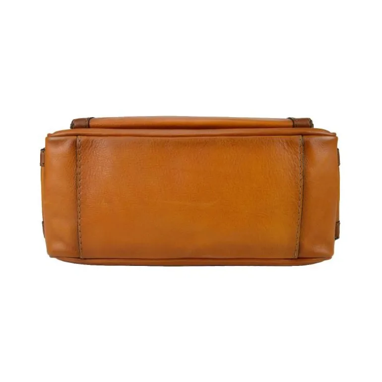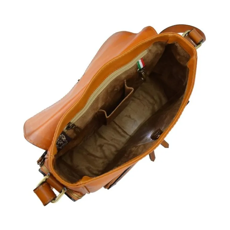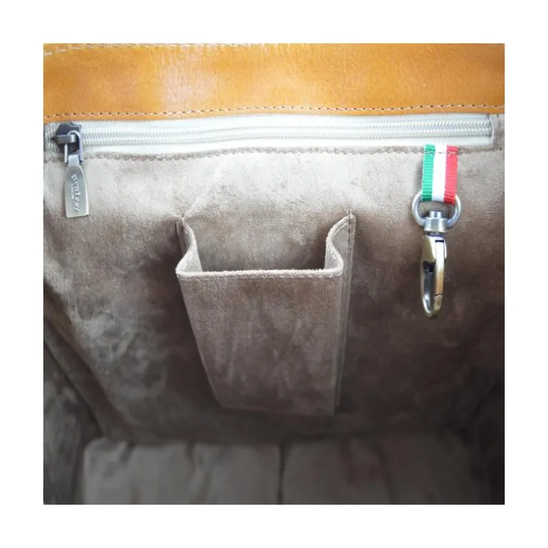 Materiał Skóra cielęca garbowana roślinnie. Szerokość 36 cm. Wysokość 28 cm. Głębokość 18 cm. Pasek Ze skóry. Zamknięcie z automatycznymi przyciskami. Waga kg 1.