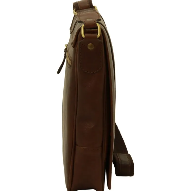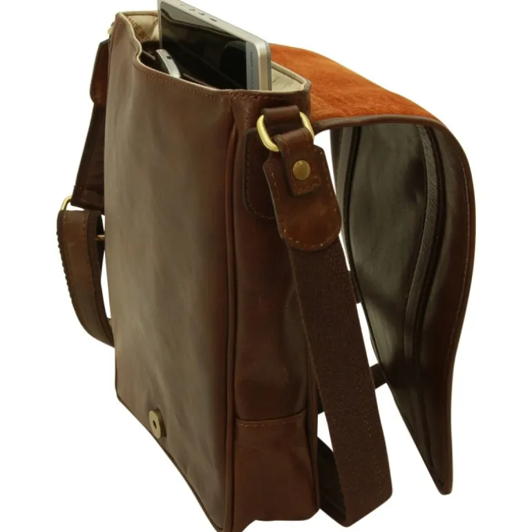 Torba na ramię ze skóry „Grudziądz” podszewka bawełniana, wyściełana komora na iPada, kieszonka wewnętrzna na telefon, kieszeń zewnętrzna na suwak, klapka na magnes, pasek ze skóry i bawełny z możliwością regulowania długości. Wymiary: 23x29x6 cm Waga: 0,750 kg