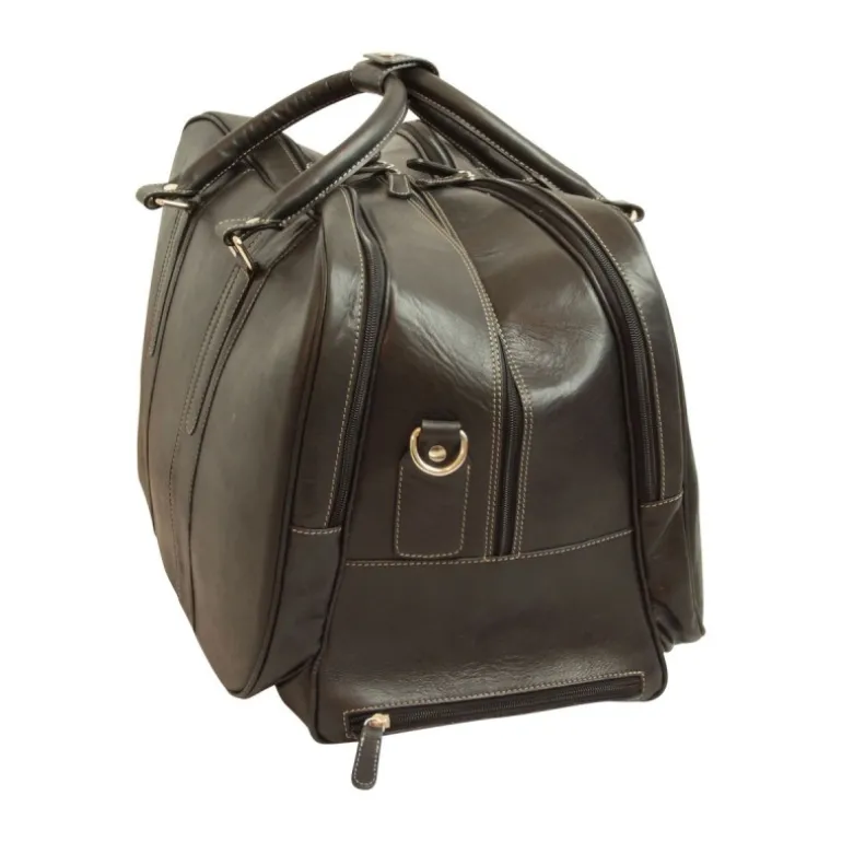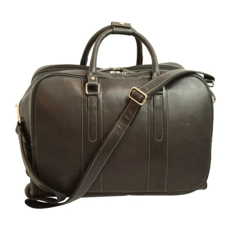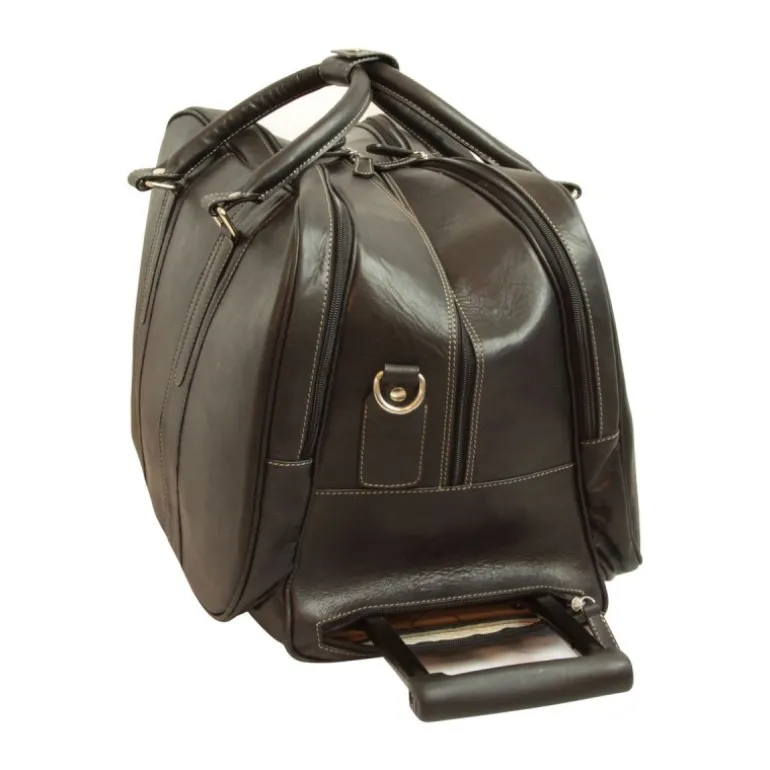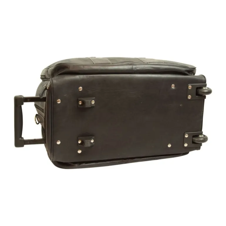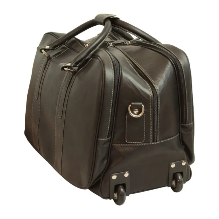 „Płock” torba podróżna skórzana na kółkach czarny. Podszewka bawełniana, trzy komory, kieszeń wewnętrzna na suwak, pasek z możliwością regulowania długości + karabińczyki.