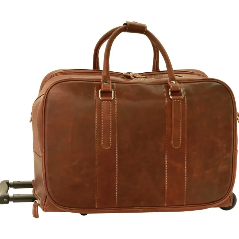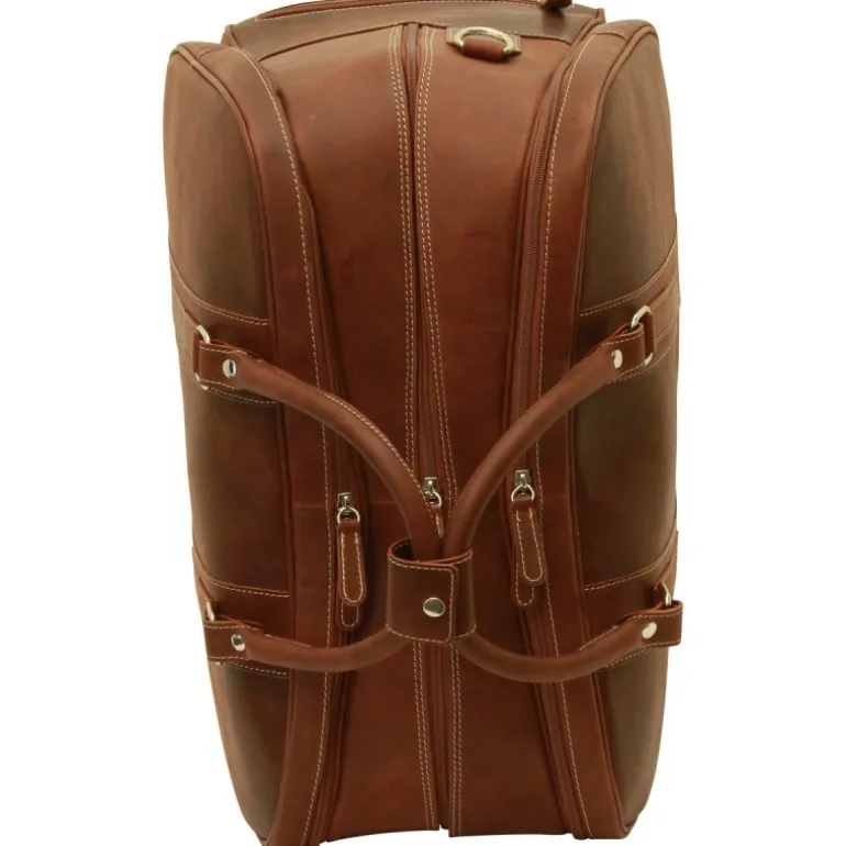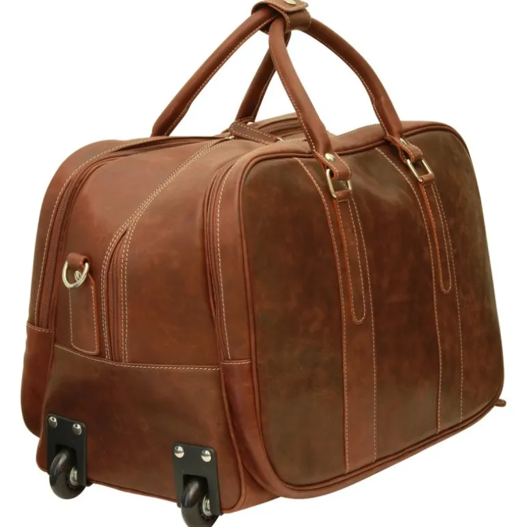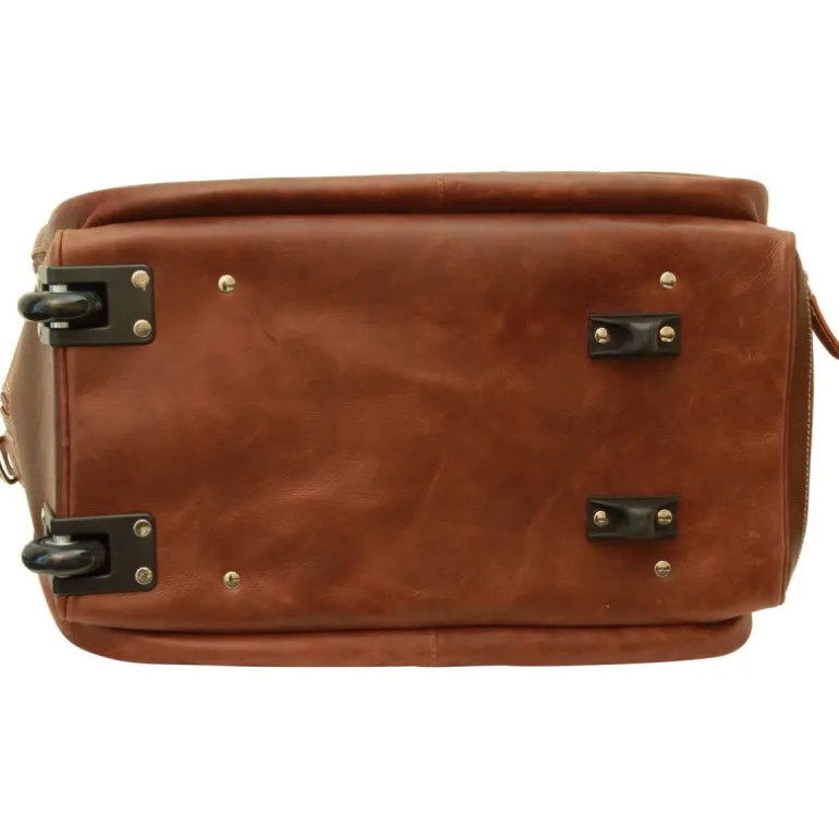„Płock” torba podróżna skórzana na kółkach brązowy. Podszewka bawełniana, trzy komory, kieszeń wewnętrzna na suwak, pasek z możliwością regulowania długości + karabińczyki.