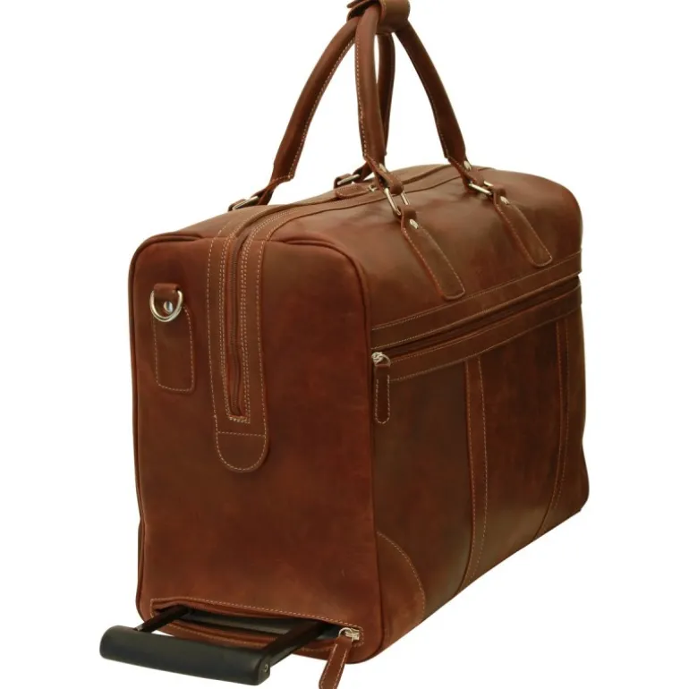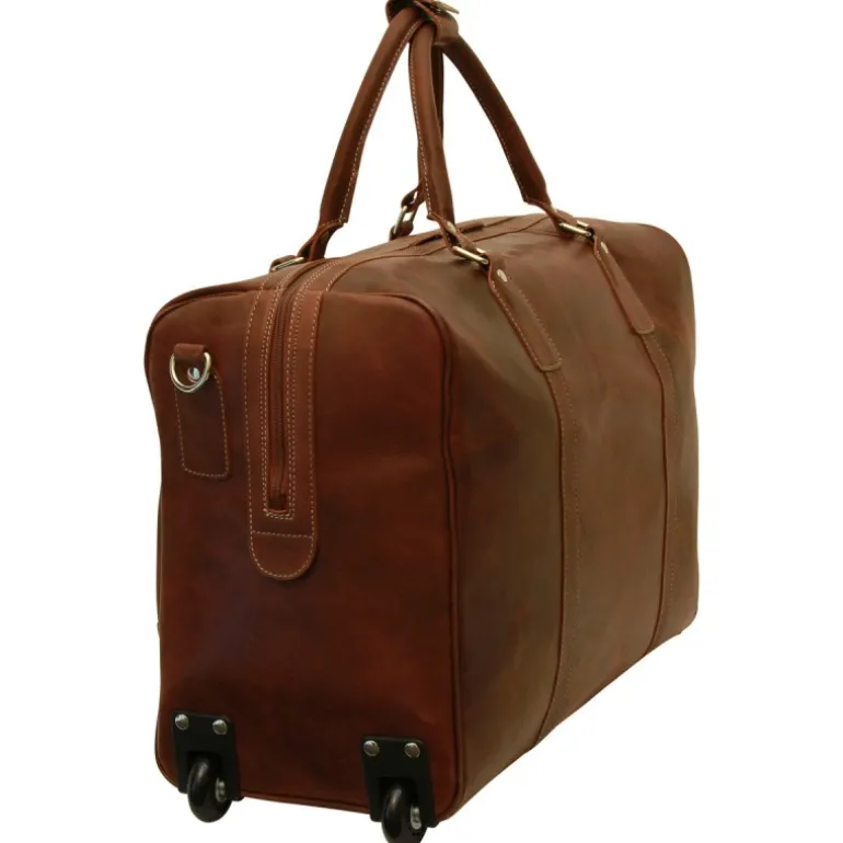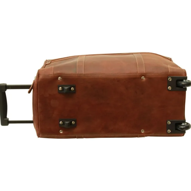 Torba podróżna skórzana na kółkach brązowa, podszewka bawełniana, Jedna komora, Kieszeń wewnętrzna na suwak, Z przodu kieszeń na suwak, Pasek z możliwością regulowania długości + karabińczyki. Wymiary: 50x35x22 cm. Waga: 3,100 kg.
