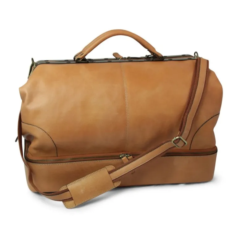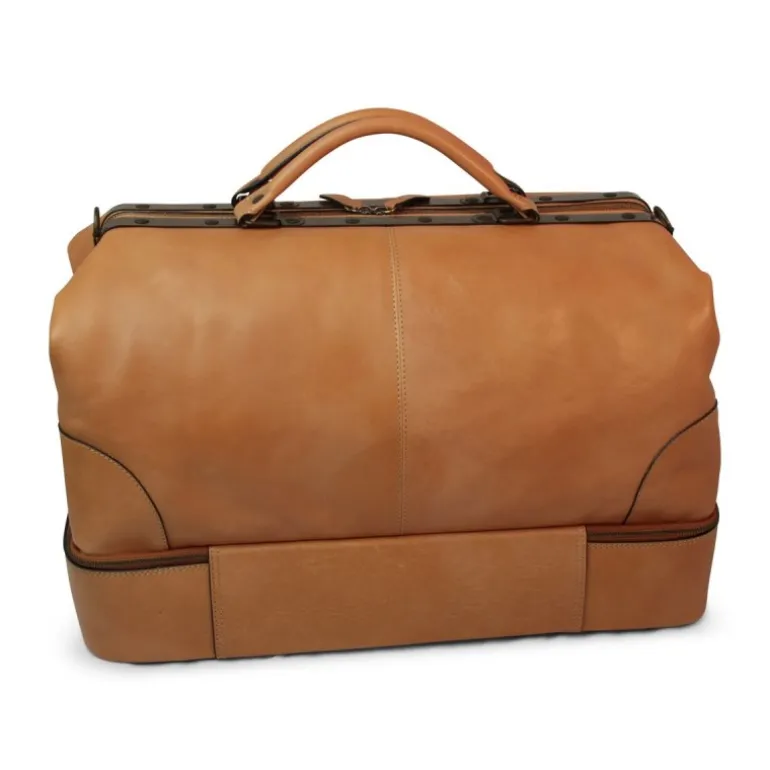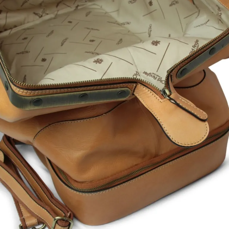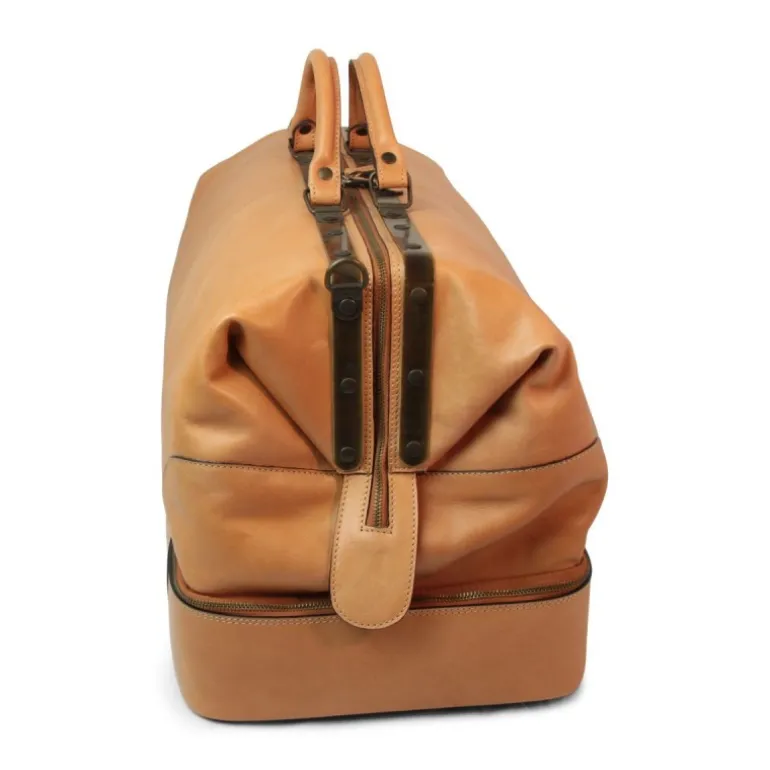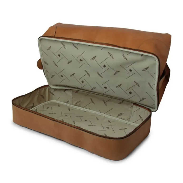 Torba podróżna ze skóry licowej w kolorze koniakowym, podszyta bawełną, z wewnętrzną kieszenią na zamek. Dno zabezpieczone stopkami z żelaza w kolorze antycznego mosiądzu, zamknięcie zawiasowe z żelaza w kolorze antycznego mosiądzu, komora na dolna do buty, model „Vecchia America” („Stara Ameryka”)