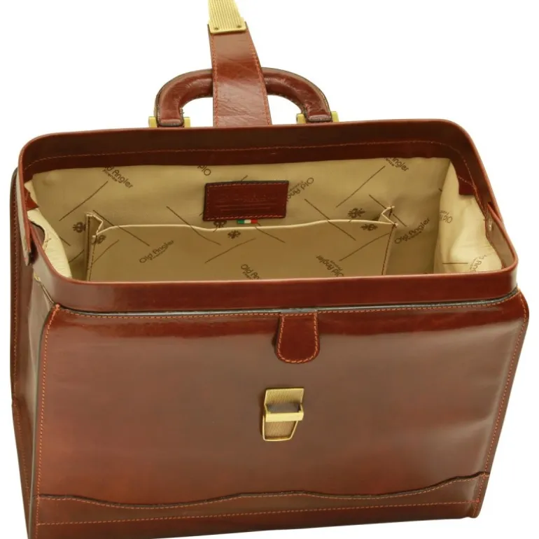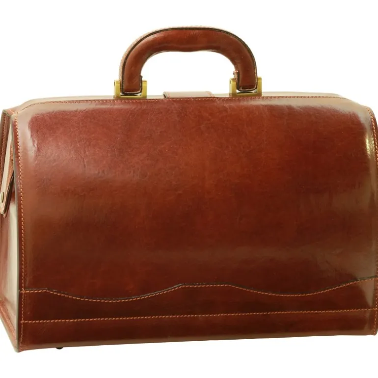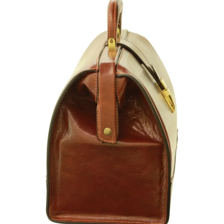 Aktówka medyczna ze skóry licowej, podszyta bawełną, zamykana na klucz, wewnątrz otwarta kieszonka około 30 cm, dno zabezpieczone mosiężnymi stopkami.