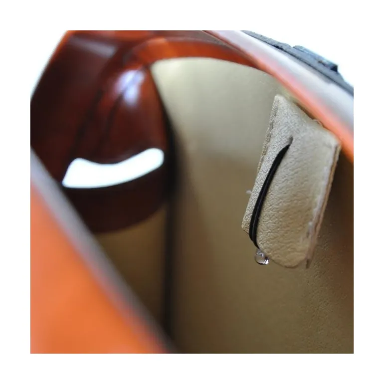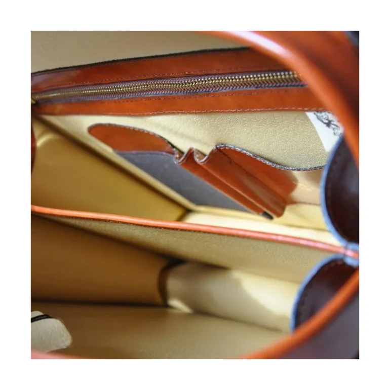 Aktówka na laptopa z włoskiej skóry, posiada trzy wewnetrzne komory, szeroką kieszeń zamykaną na zamek, dwie szlufki na długopisy, kieszonkę na telefon komórkowy oraz małą kieszonkę otwartą. Teczka jest zamykana na klucz. Dodatkowo sympatyczne światło, które gaśnie automatycznie po 30 sekundach po zapaleniu. W wyposażeniu bawełniany worek. Materiał Skóra cielęca. Szerokość 43 cm. Wysokość 34 cm. Głębokość 12 cm. Uchwyt/Pasek Metal pokryty skórą. Części metalowe Mosiądz. Zamknięcie Zamykana na klucz. Waga kg 1,95.