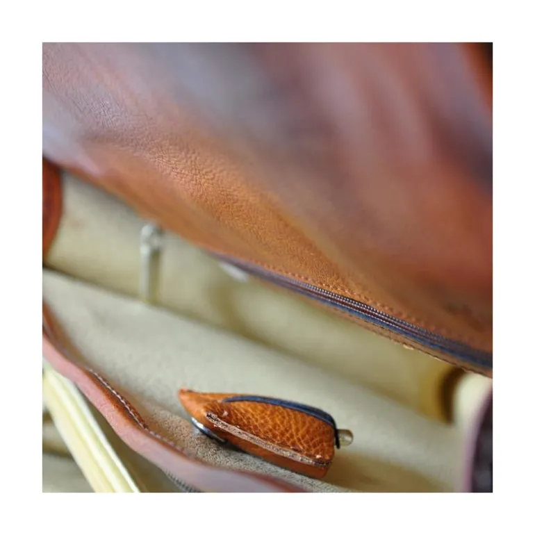 Materiał Skóra cielęca. Szerokość 39 cm. Wysokość 26 cm. Głębokość 10 cm. Rączka Metal pokryty skórą. Części metalowe Mosiądz. Zamknięcie Na klucz. Waga kg 2.