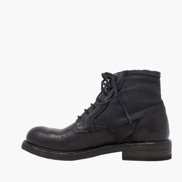 Botki zostały wykonane z płótna canvas oraz ze skóry bawolej w formie crust, garbowanej roślinnie. Szycie zostało zrealizowane w technice IDEAL.