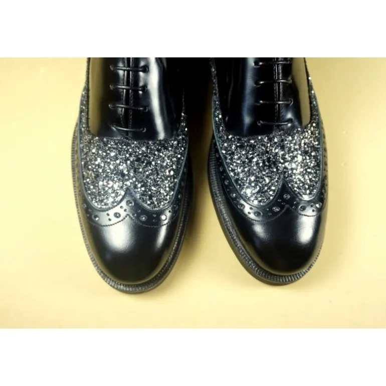 Ekskluzywne skórzane buty Milva przyciągają spojrzenia elegancką sylwetką oraz przepięknym wykonaniem. Buty powstały z połączenia doskonałej jakości włoskiej skóry cielęcej oraz luksusowego materiału z efektem Swarovski – Ciemne Srebro. Całość urzeka wyrafinowaną elegancją i prezentuje się niebywale efektownie.