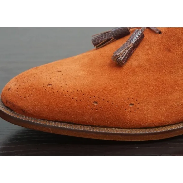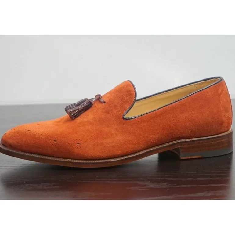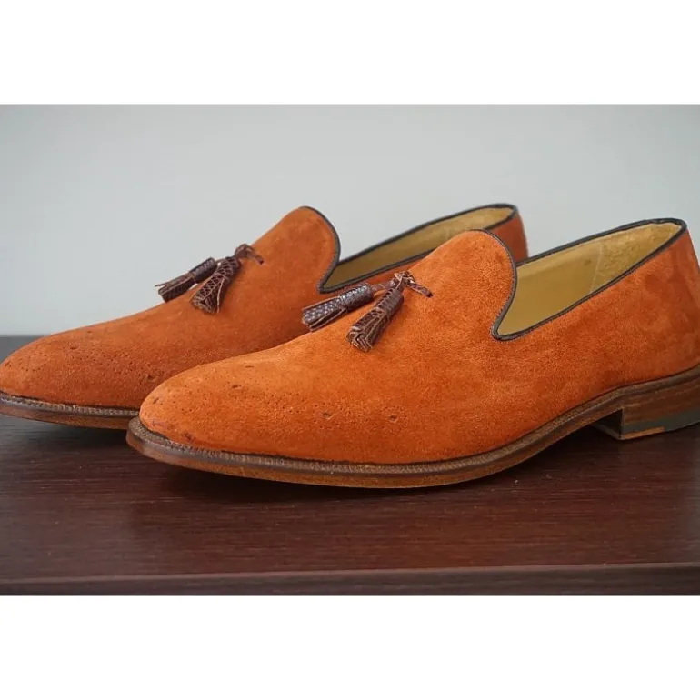Opis : Przepiękne buty dla ekscentrycznych mężczyzn, którzy lubią odważne kolory. Utrzymane w stylu fashion. Wyrób rzemieślniczy, w kolorze pomarańczowym o odcieniu suede arancio z frędzlami ze skóry cielecej z tłoczeniem imitującycm skórę jaszczurki Tejus. Wyjątkowo ekskluzywne!
