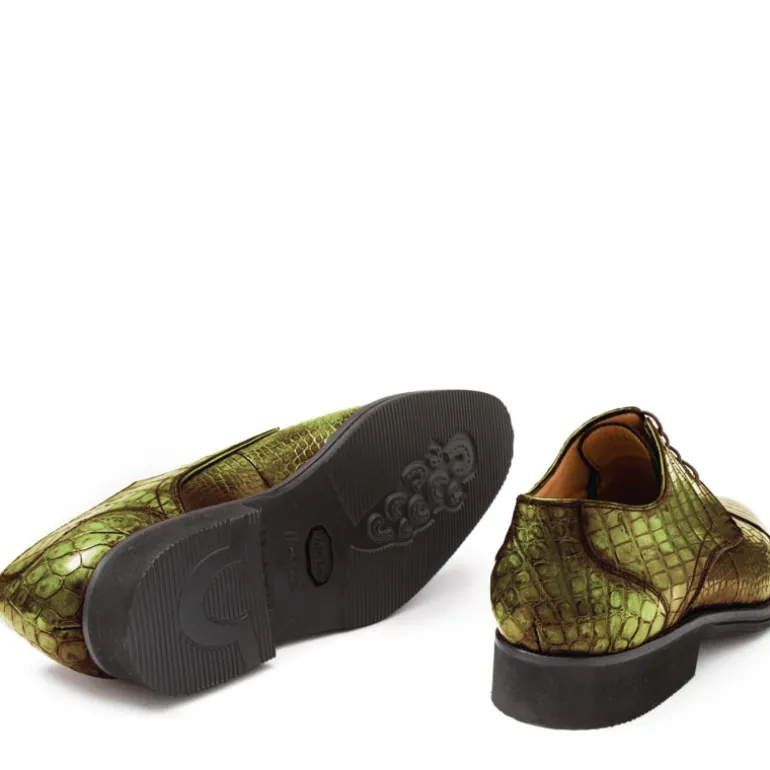 Buty męskie Skóra gładka z krokodyla. Męskie sznurowane buty, model derby, wykonane ręcznie z autentycznej postarzanej skóry aligatora Mississippiense, szlachetnej skóry, która upiększa prestiżowy design. Piękno charakterystycznych łusek potęgują niepowtarzalne efekty chromatyczne dzięki ręcznej technice farbowania, zdolnej nadać skórze krokodyla opalizujące niuanse i niezwykły połysk. Doświadczenie tradycyjnej włoskiej konstrukcji, miękkie skórzane wnętrze, ultralekka gumowa podeszwa wzbogacają ekskluzywny kunszt tej pięknej kreacji.