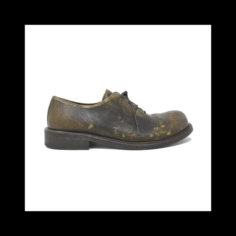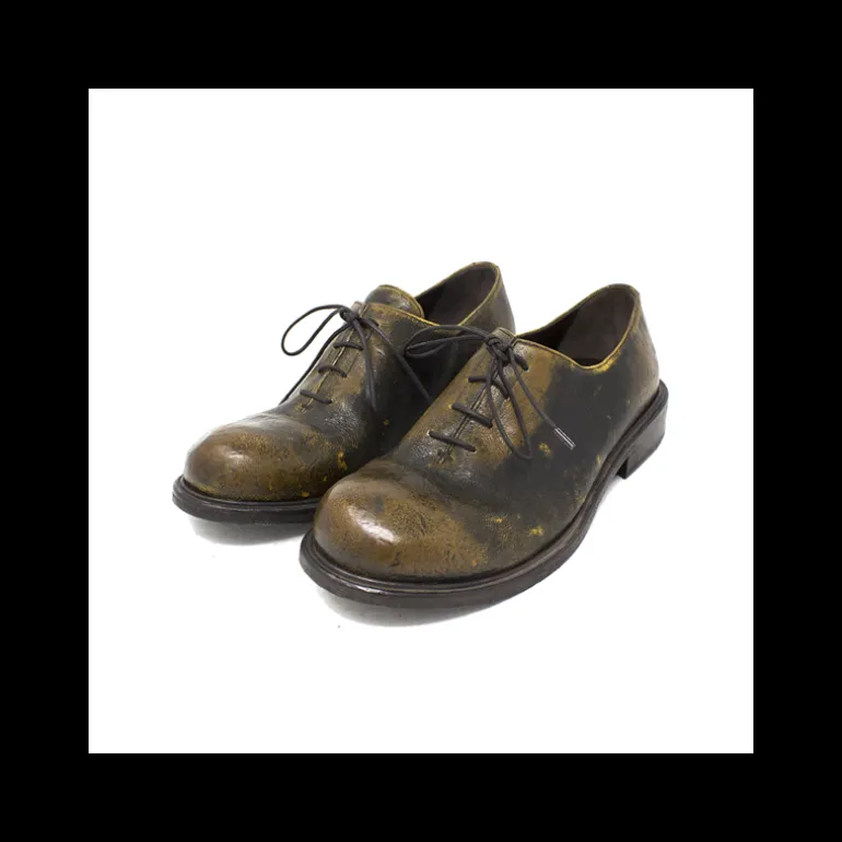 Buty zostały zrealizowane ze skóry cielęcina w formie crust, garbowanej roślinnie.