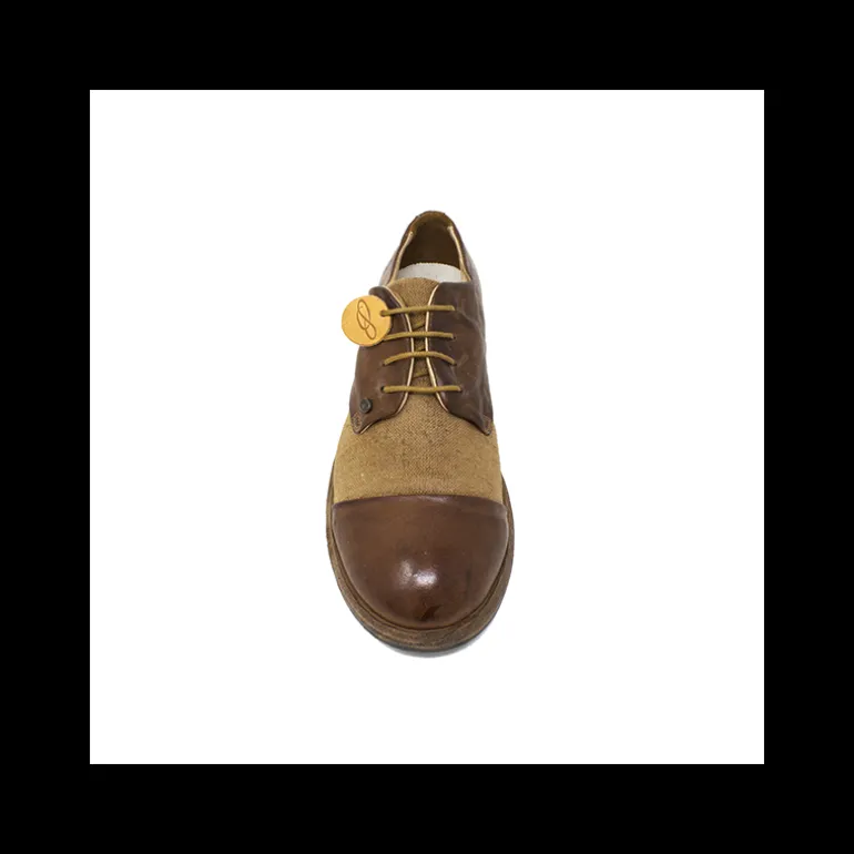 Skórzane buty męskie w starym stylu, buty zostały wykonane z płótna canvas oraz ze skóry bawolej w formie crust, garbowanej roślinnie. W dalszej kolejności buty zostały zanurzone w roztworach o naturalnym kolorze otrzymanym z tanin (kora drzew), a następnie wyprane w specjalnych maszynach wraz z kamieniami. Tego typu obróbka nadaje butom miękkość.