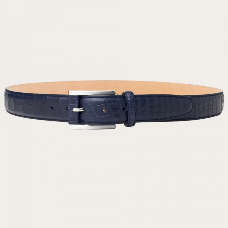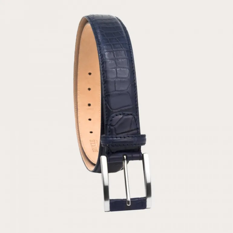 Ekskluzywny niebieski pasek ze skóry aligatora; klejnot rzemiosła, wykończony pokrytą skórą klamrą i dopasowanymi szwami.