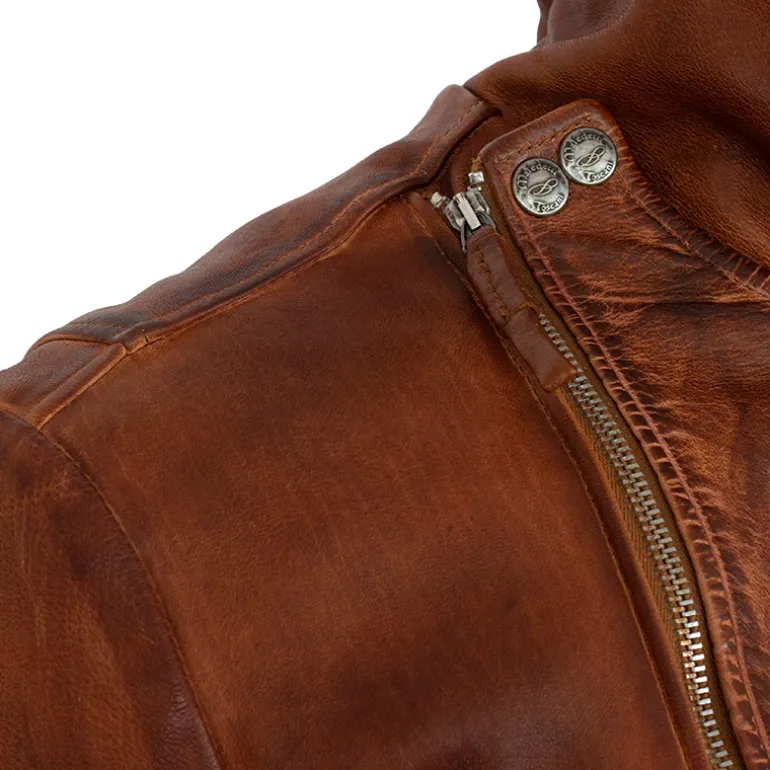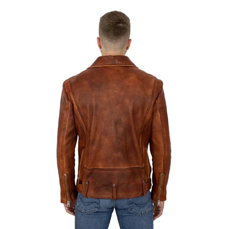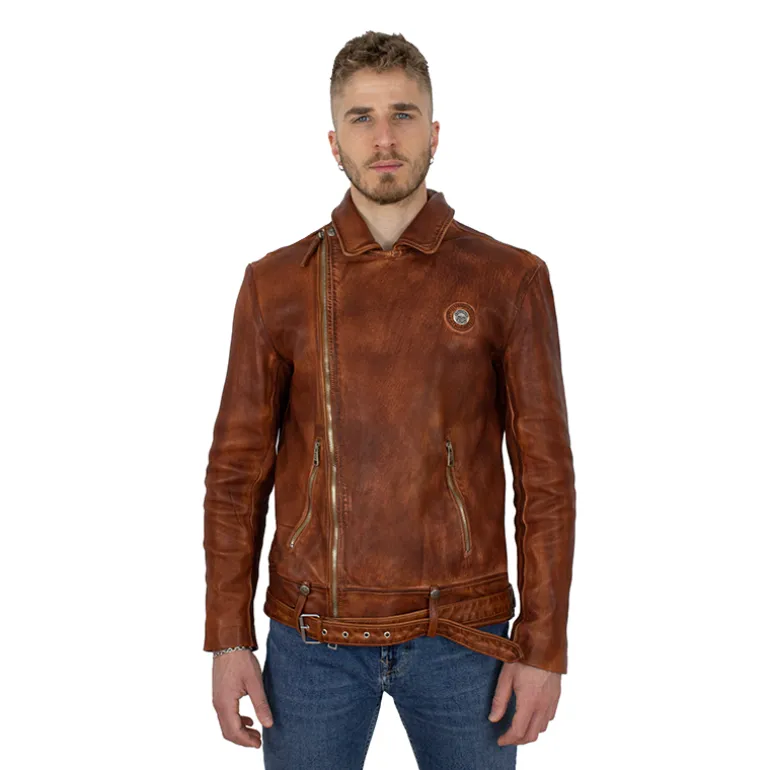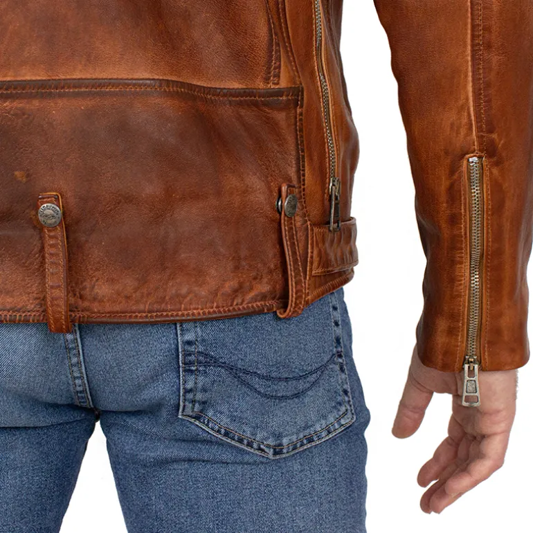 Kurtka męska ze skóry „Rider” Kurtka została wykonana ze skóry baraniej, garbowanej roślinne. Kurtka została wyprana w specjalnych maszynach, czego rezultatem jest efekt pomarszczenia. W dalszej kolejności, dzieki specjalnym produktom, nadaje się jej trwały kolor. Kurtka ze skóry baraniej, 4 kieszenie zamykane na suwak, suwaki na końcach rękawów.