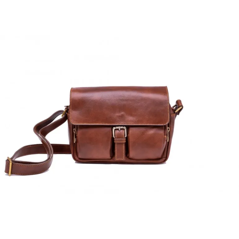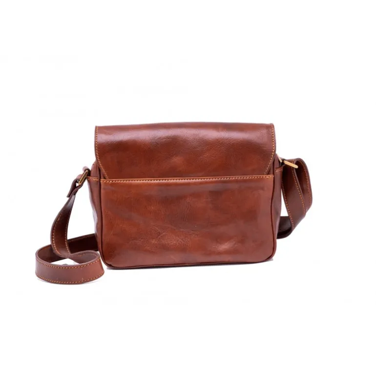 Pasek ze skóry z możliwością regulowania długości, nisko zachodząca klapa zamykana na magnes, okucia z postarzonego i szczotkowanego mosiądzu, skóra 100% made in italy garbowana roślinnie i ręcznie gąbką, podszewka w szkocką kratę, 1 komora, 2 kieszeń z przodu zamykana na zamek, 1 kieszeń z tyłu.