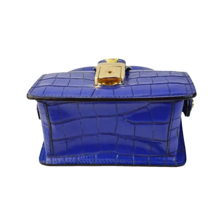 Materiał Skóra cielęca. Szerokość 18 cm. Wysokość 10 cm. Głębokość 9 cm. Rączka/Pasek Metal pokryty skórą. Części metalowe Pozłacane. Zamknięcie Na klucz. Waga kg 0,500