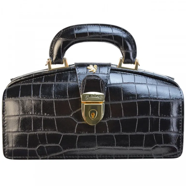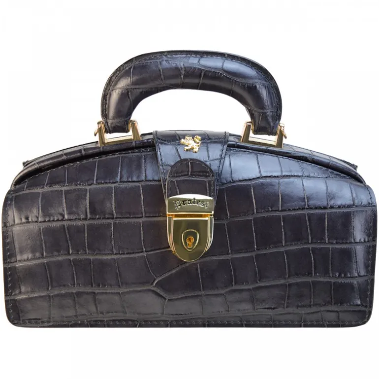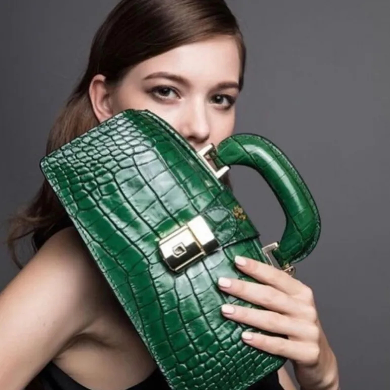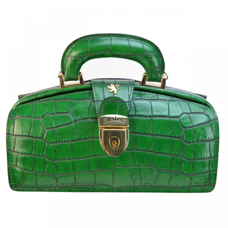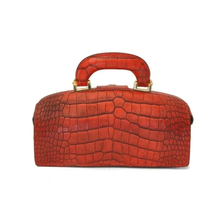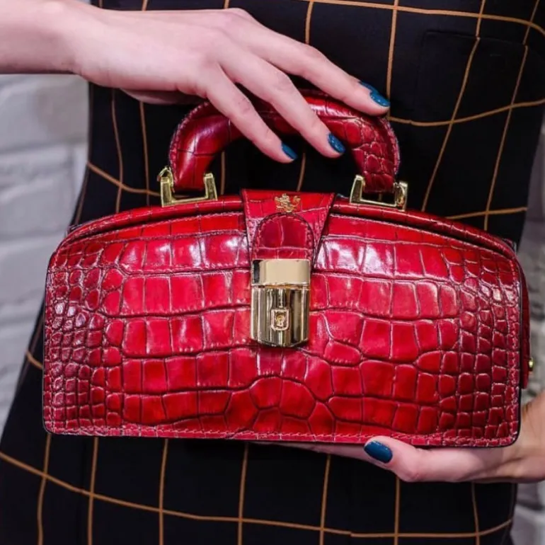 Materiał Skóra cielęca. Szerokość 27,5 cm. Wysokość 15 cm. Głębokość 11,5 cm. Rączka/Pasek Metal pokryty skórą. Części metalowe Pozłacane. Zamknięcie Na klucz. Waga kg 0,800