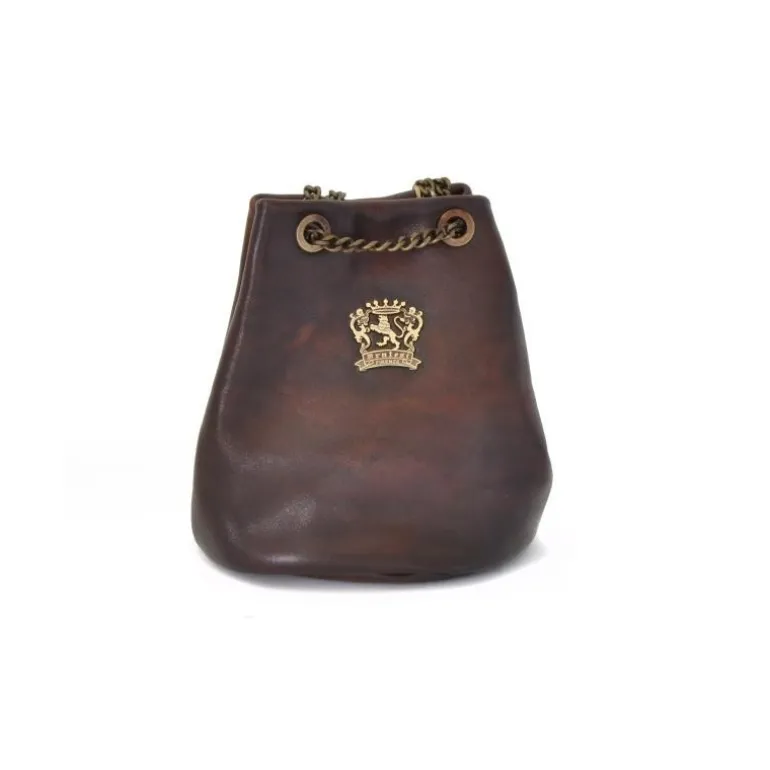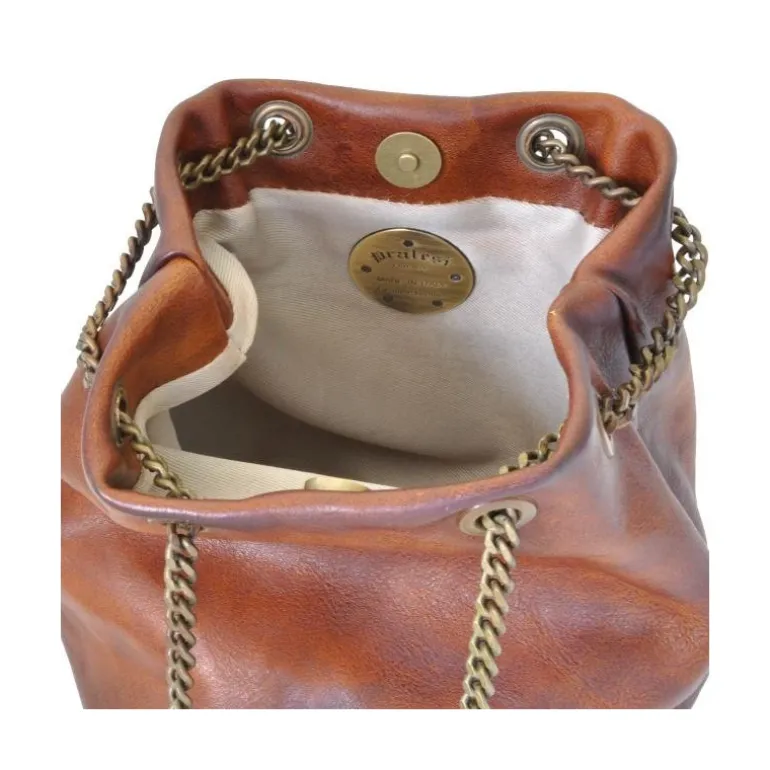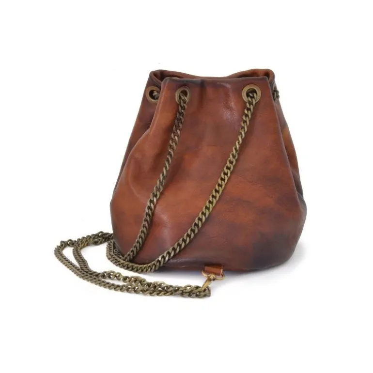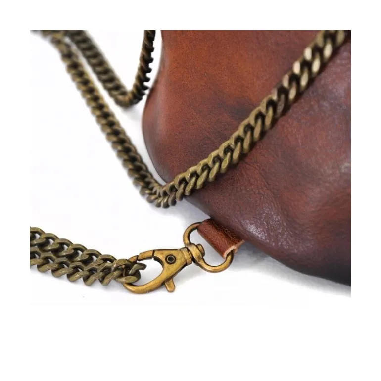 Materiał Skóra cielęca garbowana roślinnie. Szerokość 15 cm. Wysokość 18 cm. Głębokość 15 cm. Metalowy zatrzask. Długość całkowita łańcuszka: 1m 40 cm. Waga kg 0,3