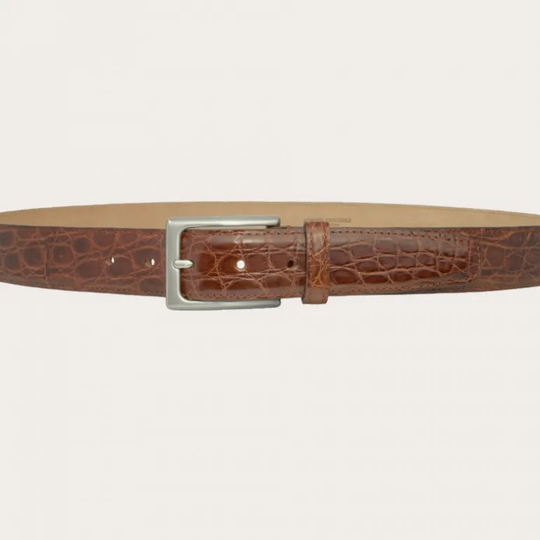Oryginalny pasek męski wykonany z brązowej skóry krokodyla. Elegancki w klasycznym kolorze, który podkreśla i uwydatnia delikatną skórę.