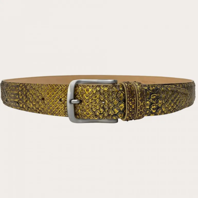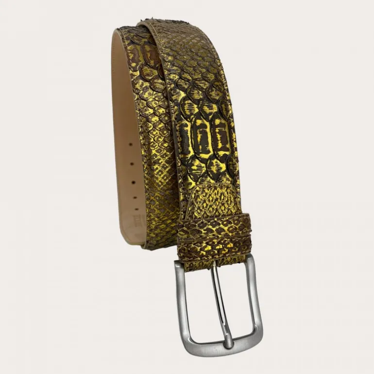Pasek z prawdziwej skóry Pytona i prawdziwej skóry. Pasek z prawdziwego złotego pytona z wycięciem z tyłu wykorzystującym wyłącznie skórę brzucha, najcenniejszą część, wysokość 4 cm. Idealny pasek na lato i dla wytwornego wyglądu z dbałością o szczegóły. Z klamrą niezawierającą niklu.