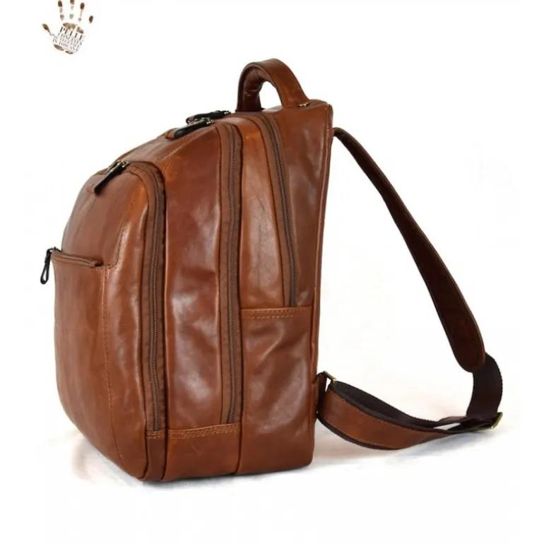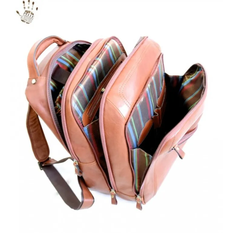 Plecak męski ze skóry bardzo dobrze wyposażony pojedyncza rączka, 1 przednia kieszeń zapinana na zamek, 3 niezależne przegrody zapinane na zamek, podszewka w kolorowe paski, akcesoria ze starego szczotkowanego mosiądzu, wewnątrz wyściełany uchwyt na komputer, uporządkowane wnętrze na dokumenty i pracę. Wymiary : 31X17X39