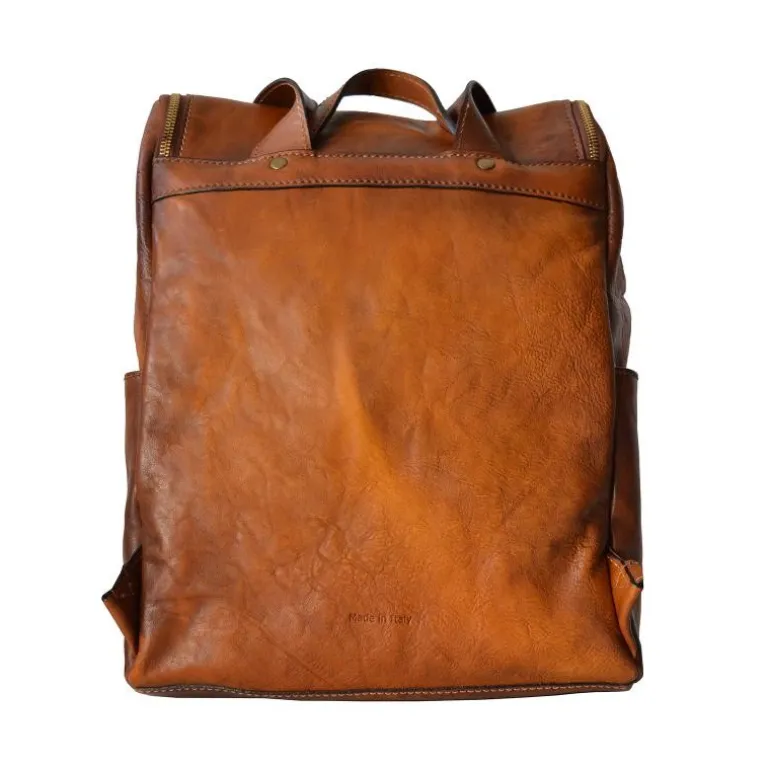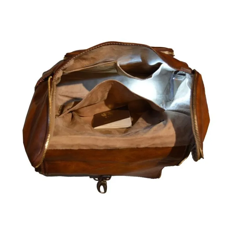 Materiał Skóra cielęca garbowana roślinnie, szerokość 33 cm, wysokość 40 cm, głębokość 15 cm, skórzana rączka, metalowy zamek błyskawiczny. Waga kg 1,00