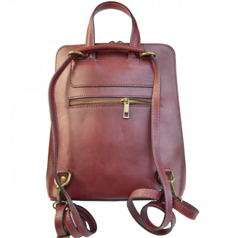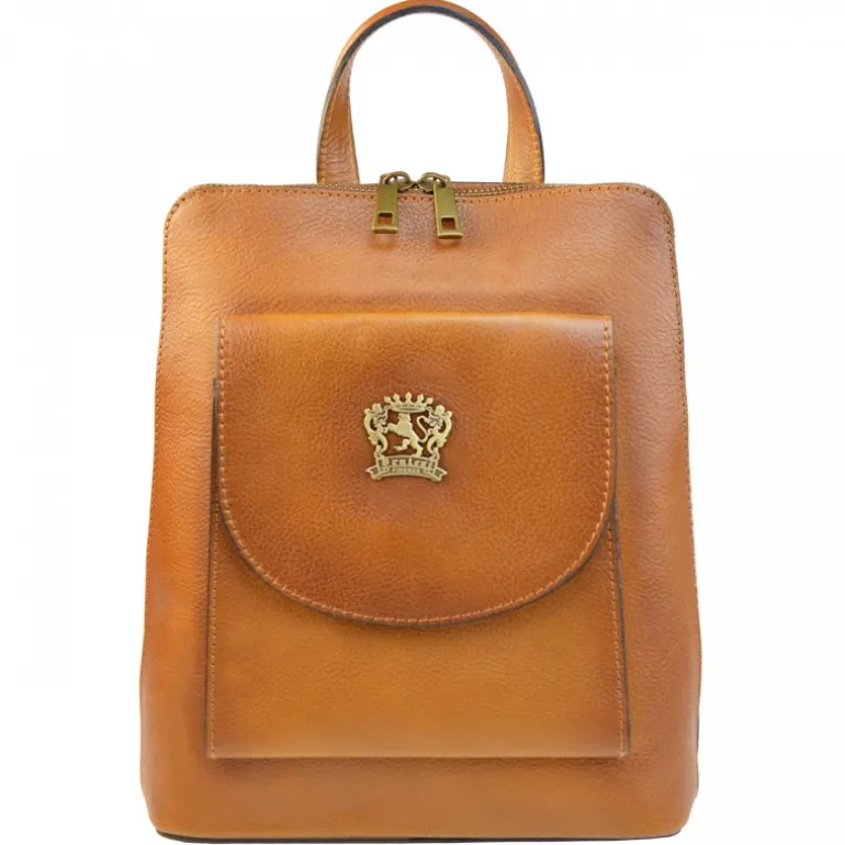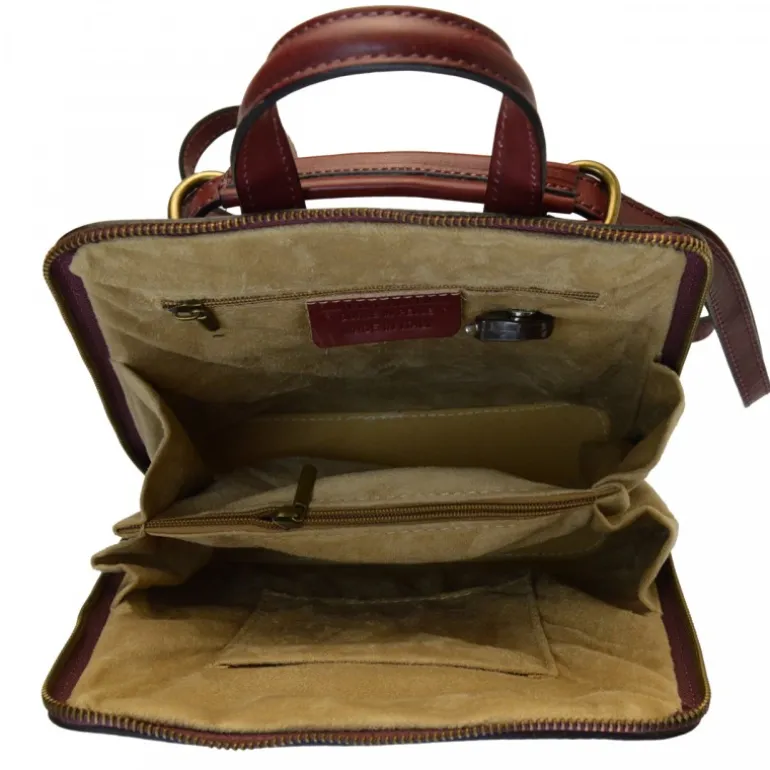 Plecak-torebka z prawdziwej włoskiej skóry garbowanej roślinnie i certyfikowana przez konsorcjum VERA PELLE, to dodatek o miękkiej konstrukcji, składający się z dużej komory, wewnątrz której znajdują się trzy kieszenie, w tym dwie zapinane na zamek, środkowa pełni funkcję jako przegroda oraz wewnętrzne światło, które wyłącza się po kilku sekundach, aby ułatwić odnalezienie ulubionych akcesoriów nawet w ciemności. Na zewnątrz znajdują się dwie kieszenie, jedna z przodu zapinana na klapkę, druga z tyłu zapinana na zamek.