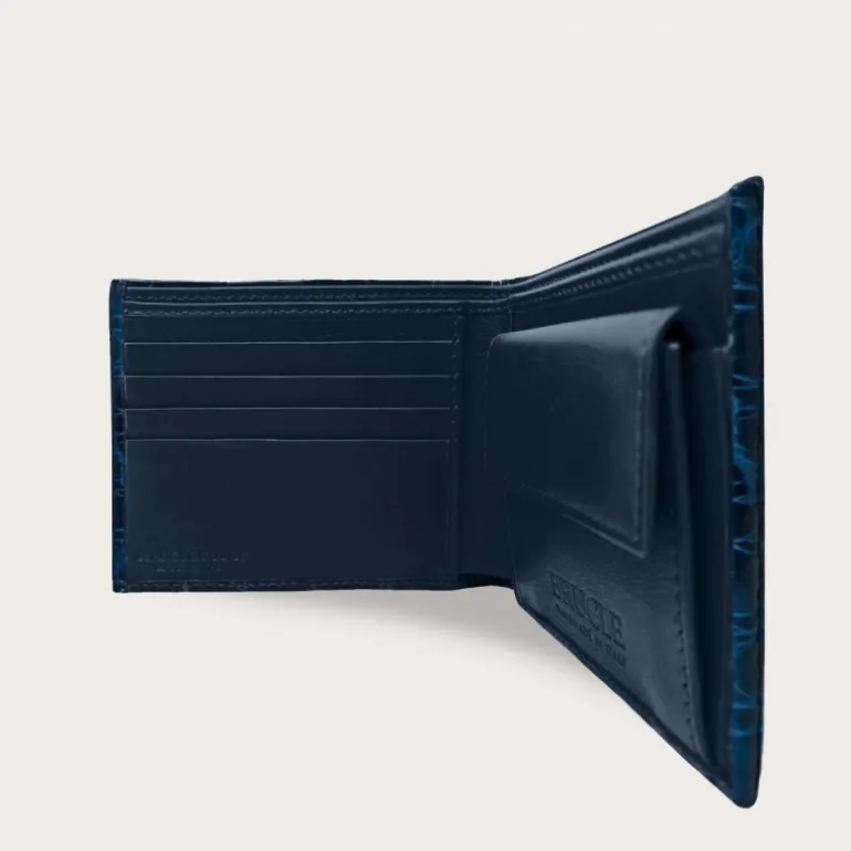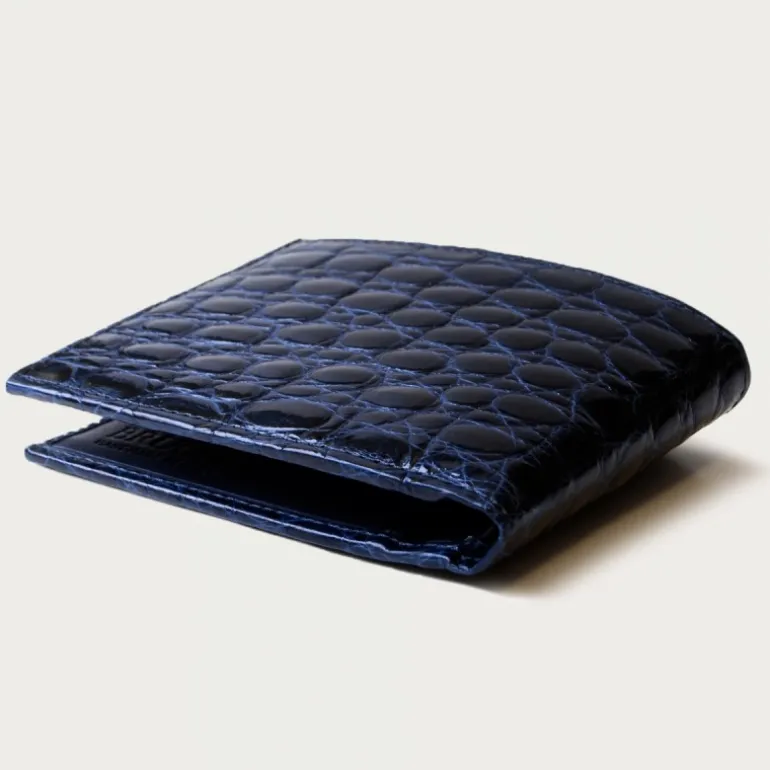 Portfel krokodyl z kieszonką na monety. Elegancki i wygodny kompaktowy portfel z prawdziwej skóry krokodyla, w błyszczącym, granatowym kolorze, który podkreśla naturalne piękno łusek. Dodatek o wyjątkowej elegancji.