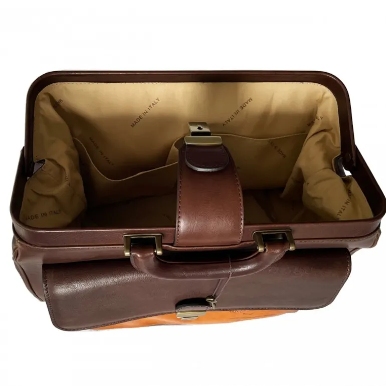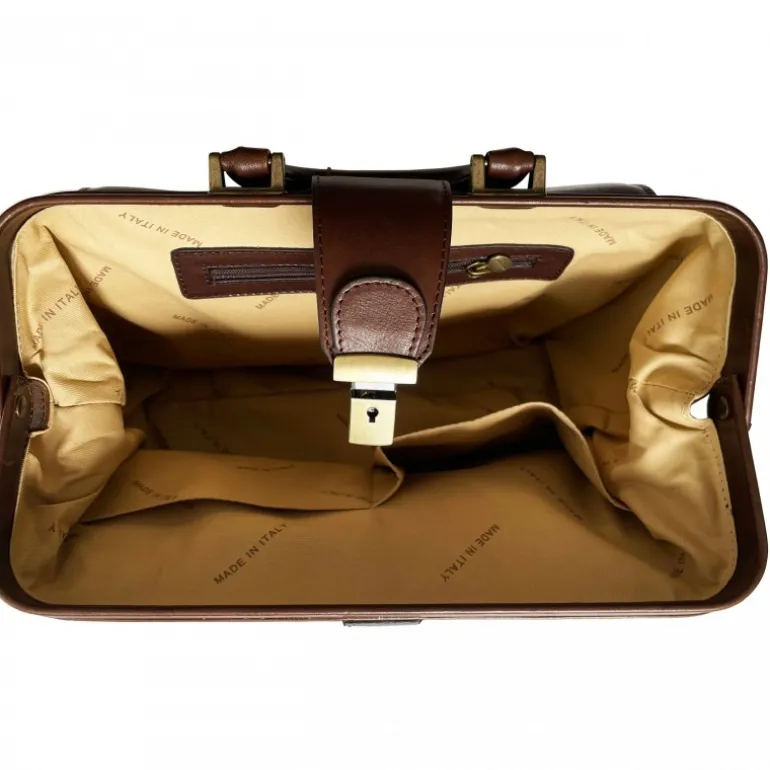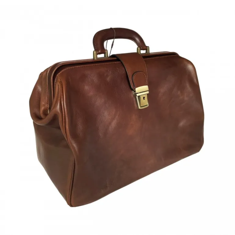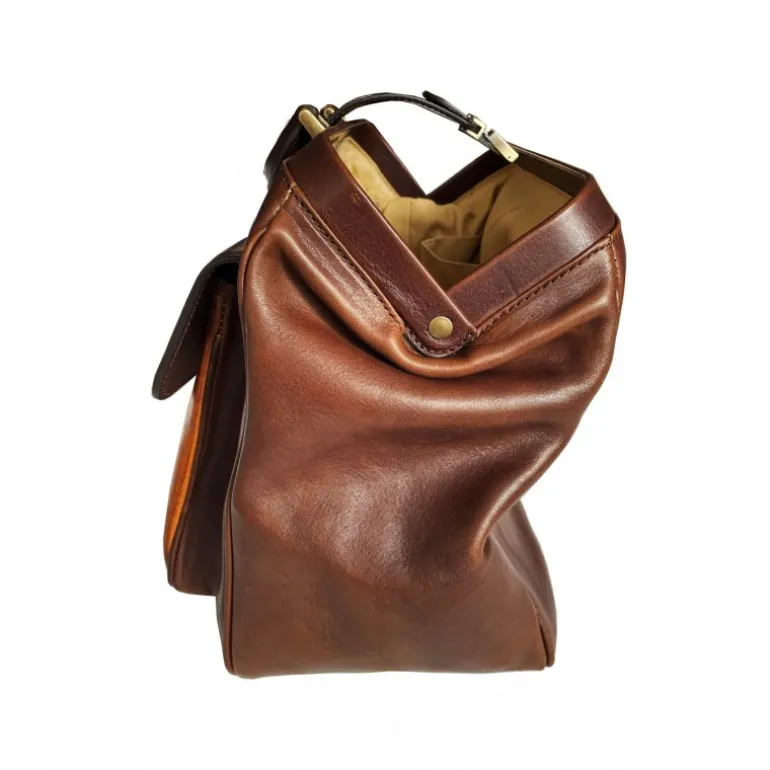 Skórzana torba lekarska z pocztówką. Styl lat czterdziestych sprawia, że ta skórzana torba lekarska jest niezbędna w każdym stylu i na każdą okazję. Tak naprawdę korzystają z niego nie tylko lekarze, ale bardzo często kobiety urzekają swoim vintage’owym urokiem. Torba wykonana jest z licowej skóry cielęcej, ma jedną dużą komorę, wnętrze jest wyłożone bawełną, posiada kieszeń zapinaną na zamek błyskawiczny, spód jest chroniony żelaznymi nóżkami w kolorze antycznego mosiądzu, a jej zamknięcie odbywa się za pomocą skórzanego paska z kluczem zamykającym..