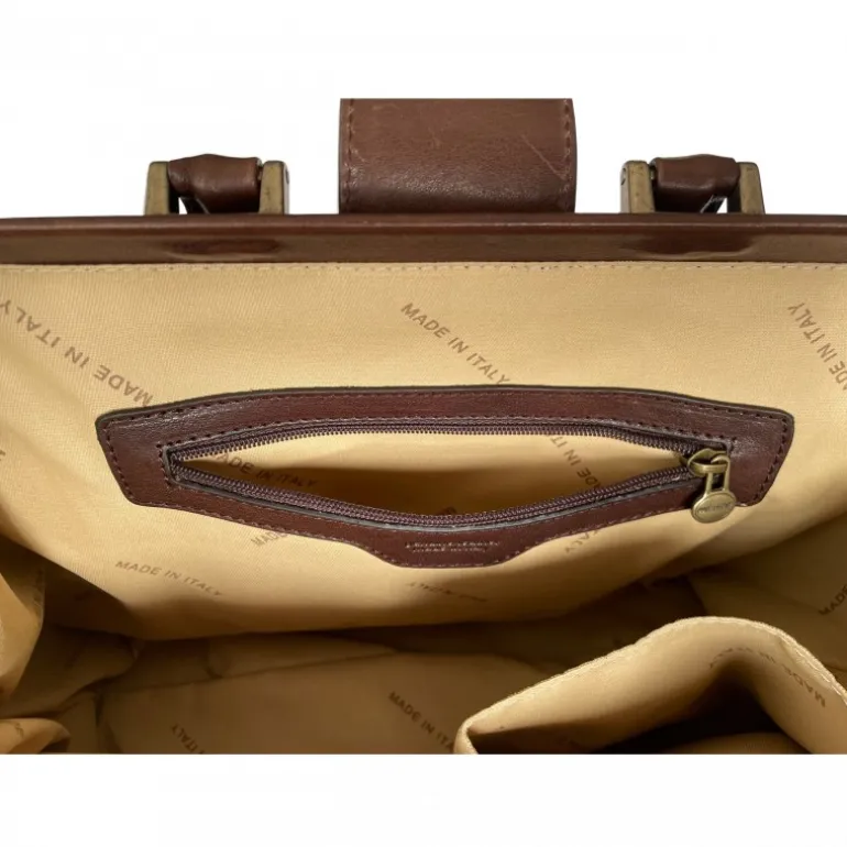 Wewnątrz: materiałowa wyściółka, jedna kieszeń wewnętrzna zapinana na klucz z suwakiem ze szczotkowanego mosiądzu, jedna dodatkowa kieszeń