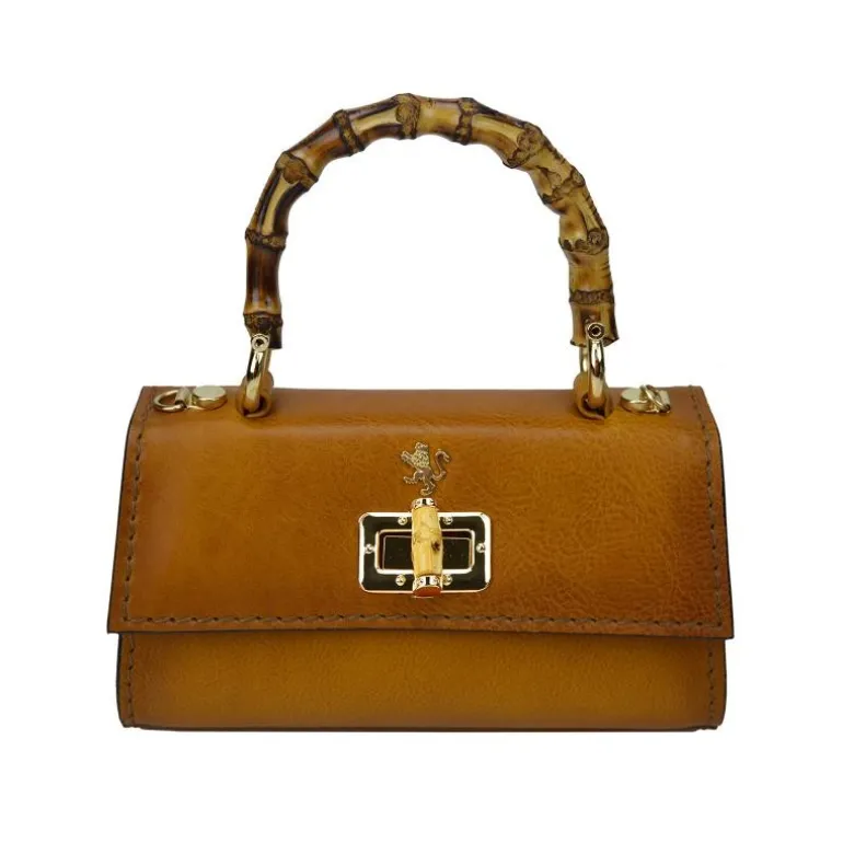 Materiał Skóra cielęca. Szerokość 28 cm. Wysokość 13 cm. Głębokość 10 cm. Bambusowy uchwyt. Zamykanie Mechanizm zamykania. Waga 0,7 kg. Pasek na ramię z metalowym łańcuszkiem